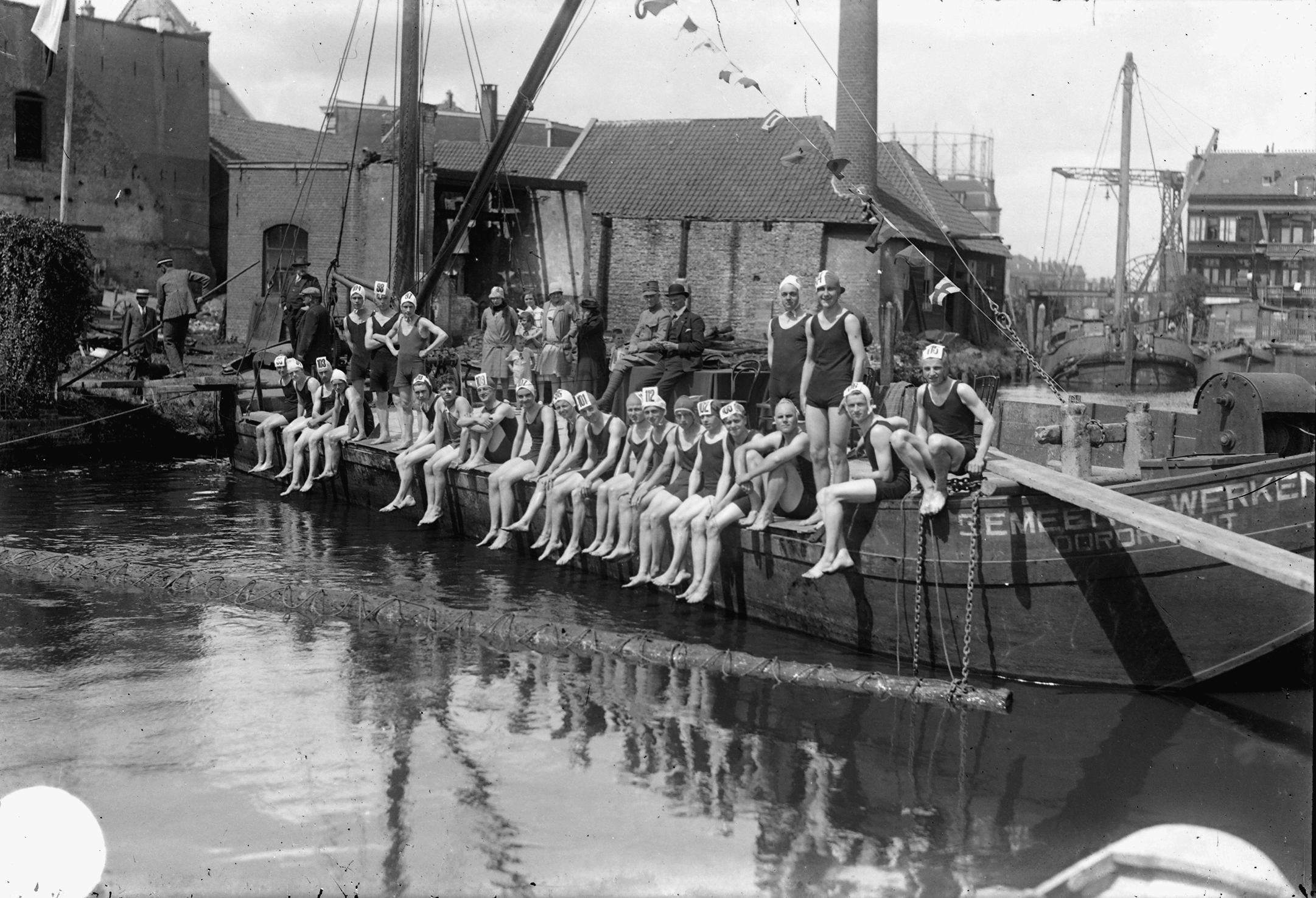 Zwemmers bij de Vest/Spuihaven. Rechts op de achtergrond de Noorderbrug en de gashouder …