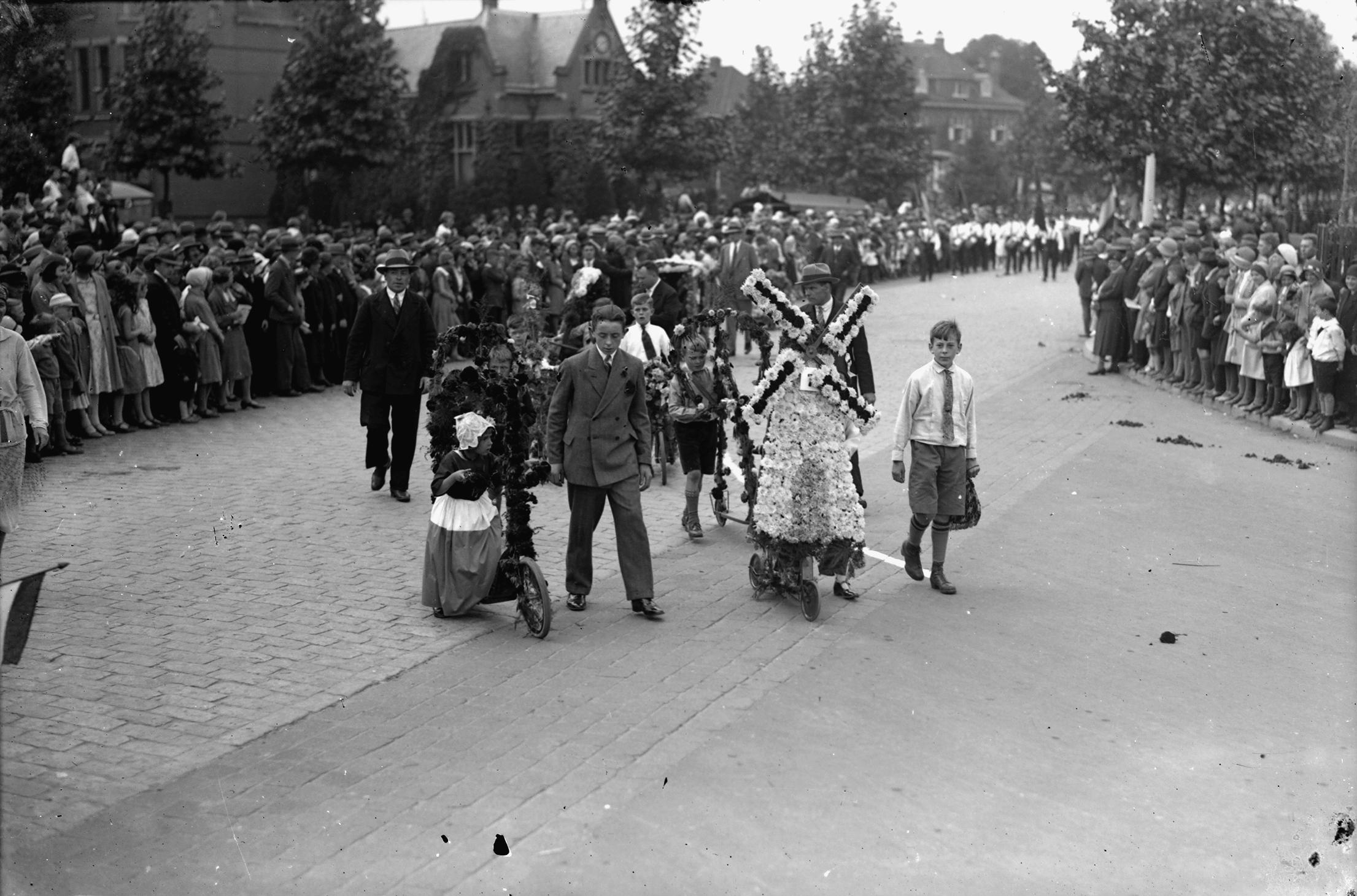 Een optocht loopt van de Vrieseweg richting Oranjelaan. In het midden de politiepost in …