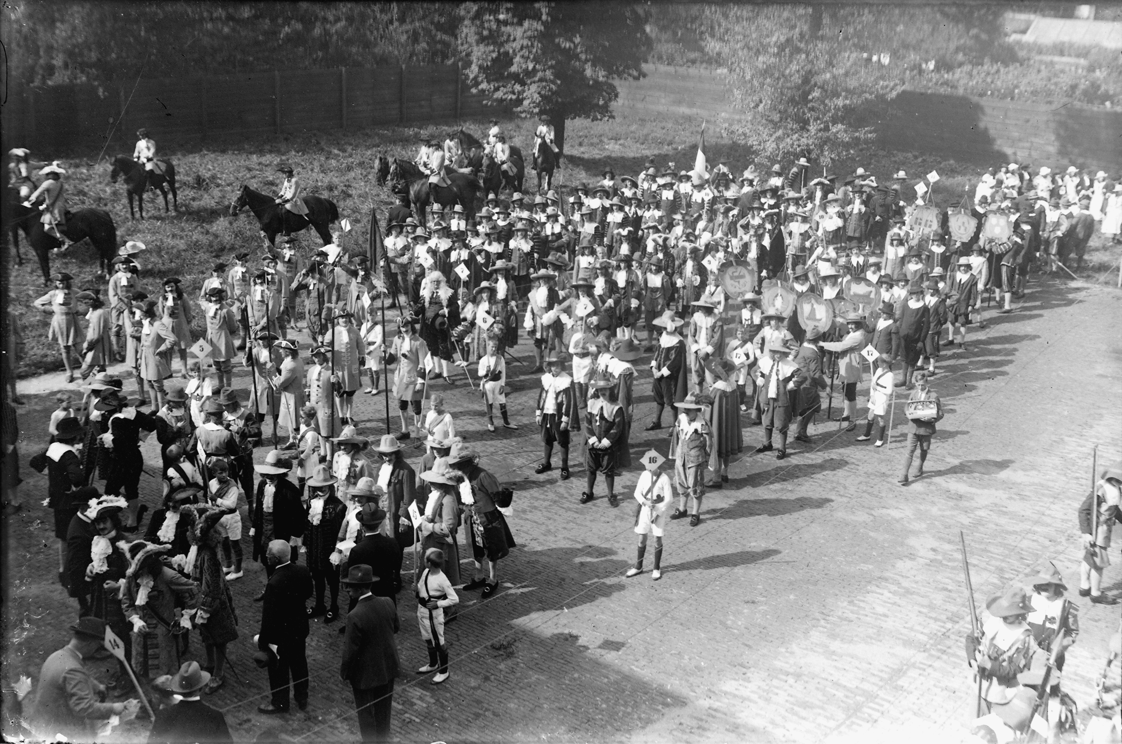 Het opstellen van een gekostumeerde optocht, waarschijnlijk op een terrein achter de …