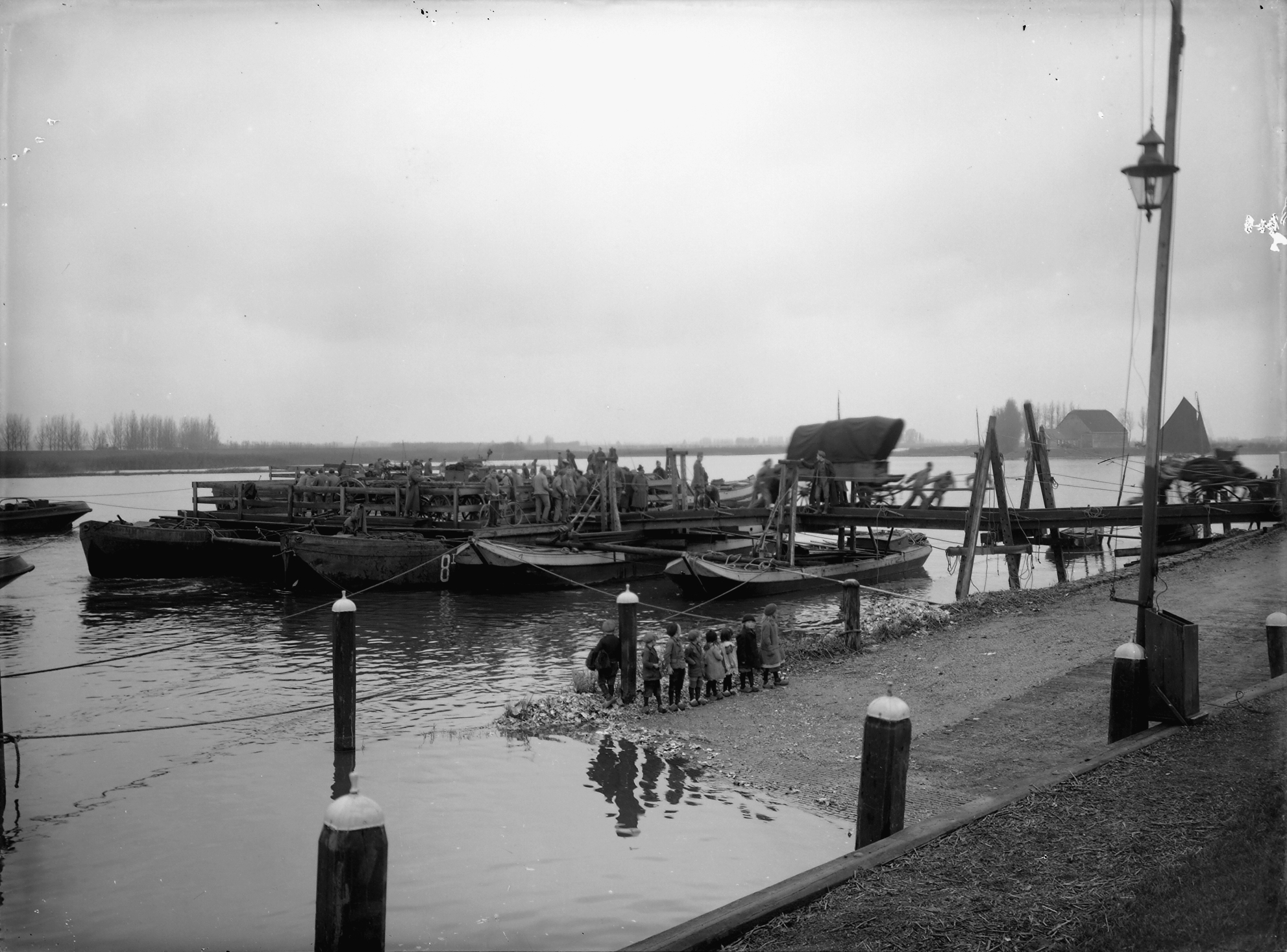 Pontonniers bij de veersteiger in Wieldrecht. Aan de overzijde van de Dordtsche Kil …