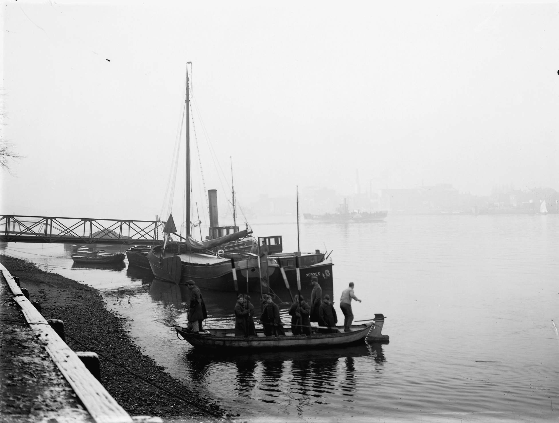 - Pontonniers op de Buiten Walevest, waarschijnlijk vanaf de Veersteiger i.v.m. laag water in de Oude Maas. De raderveerpont naar Zwijndrecht is in de mist te onderscheiden.