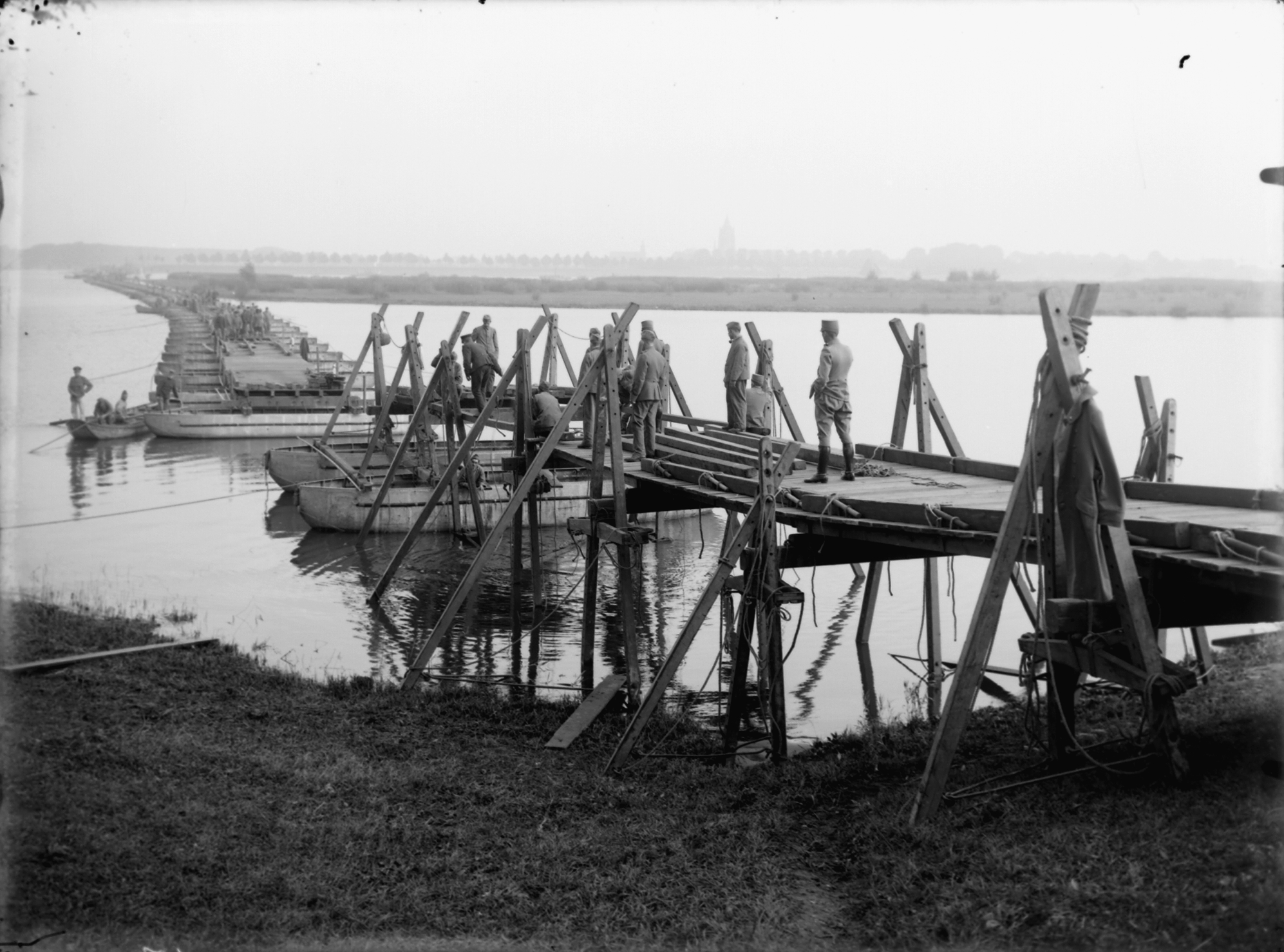 Een door pontonniers geslagen pontonbrug vanuit de haven van Sleeuwijk over de Merwede richting Gorinchem.