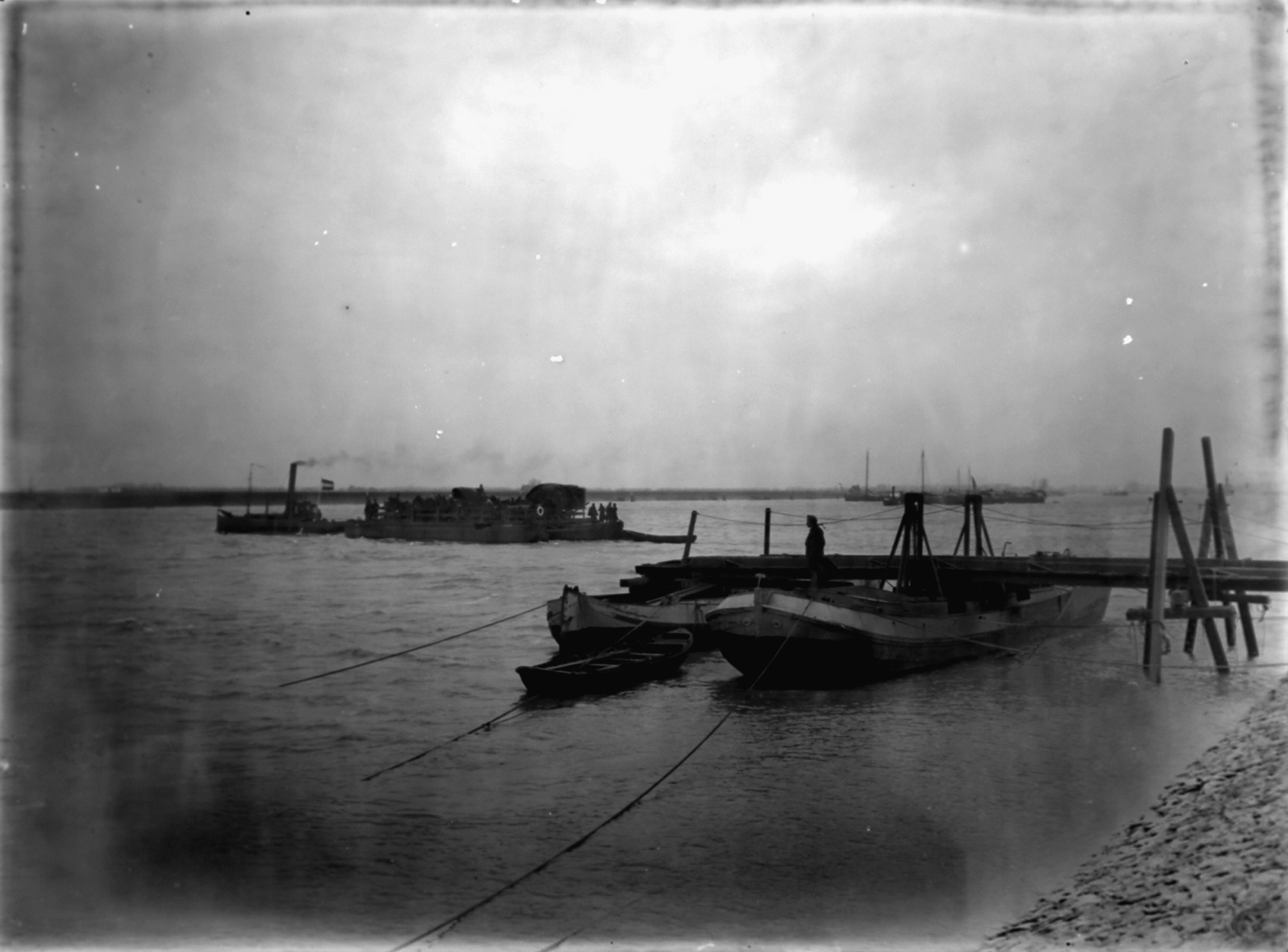Pontonniers bij de veersteiger in Wieldrecht. Aan de overzijde van de Dordtsche Kil …