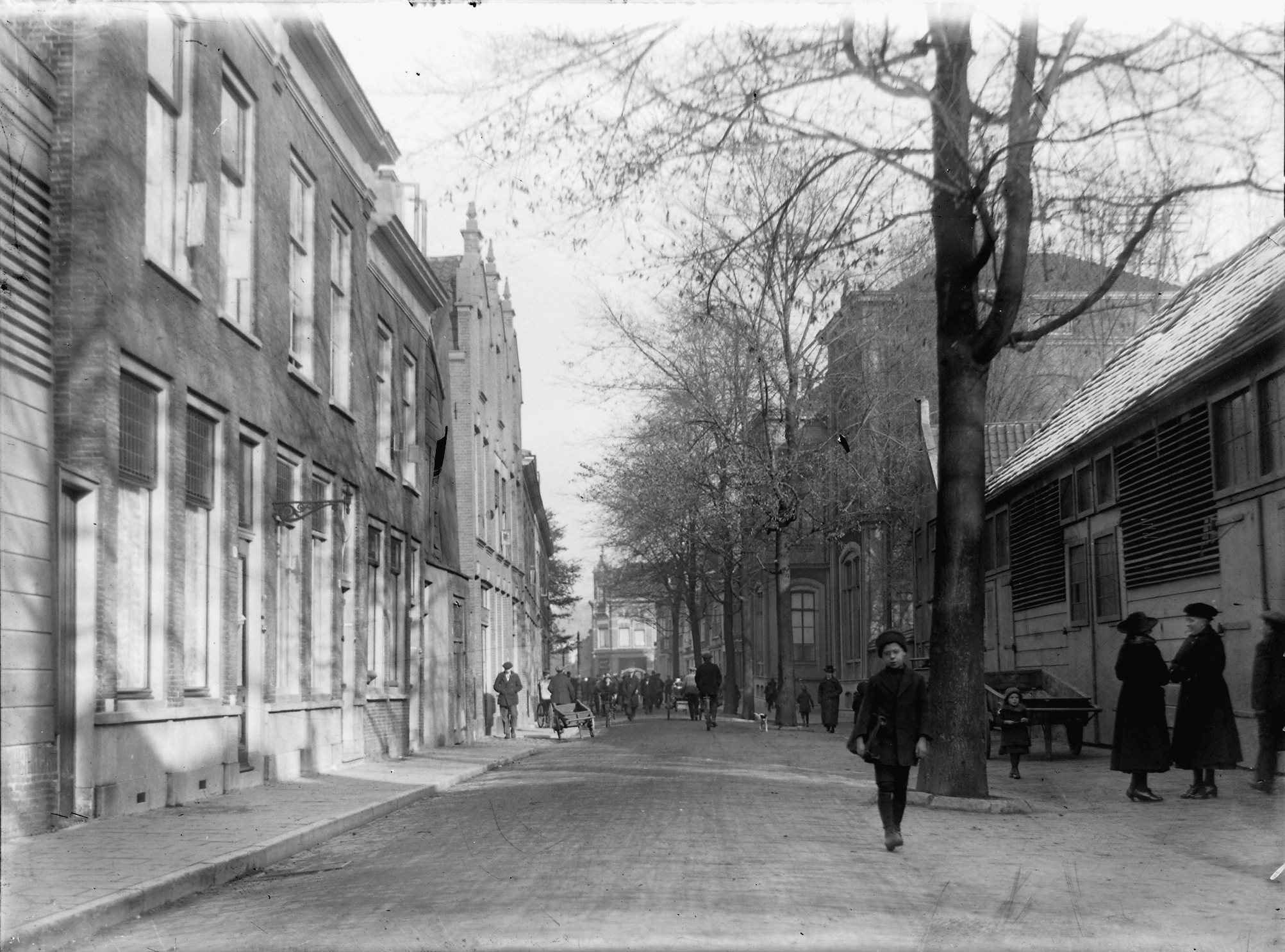 - Het Kromhout in de richting van de Sint Jorisweg. Het hoge gebouw rechts is het weeshuis.