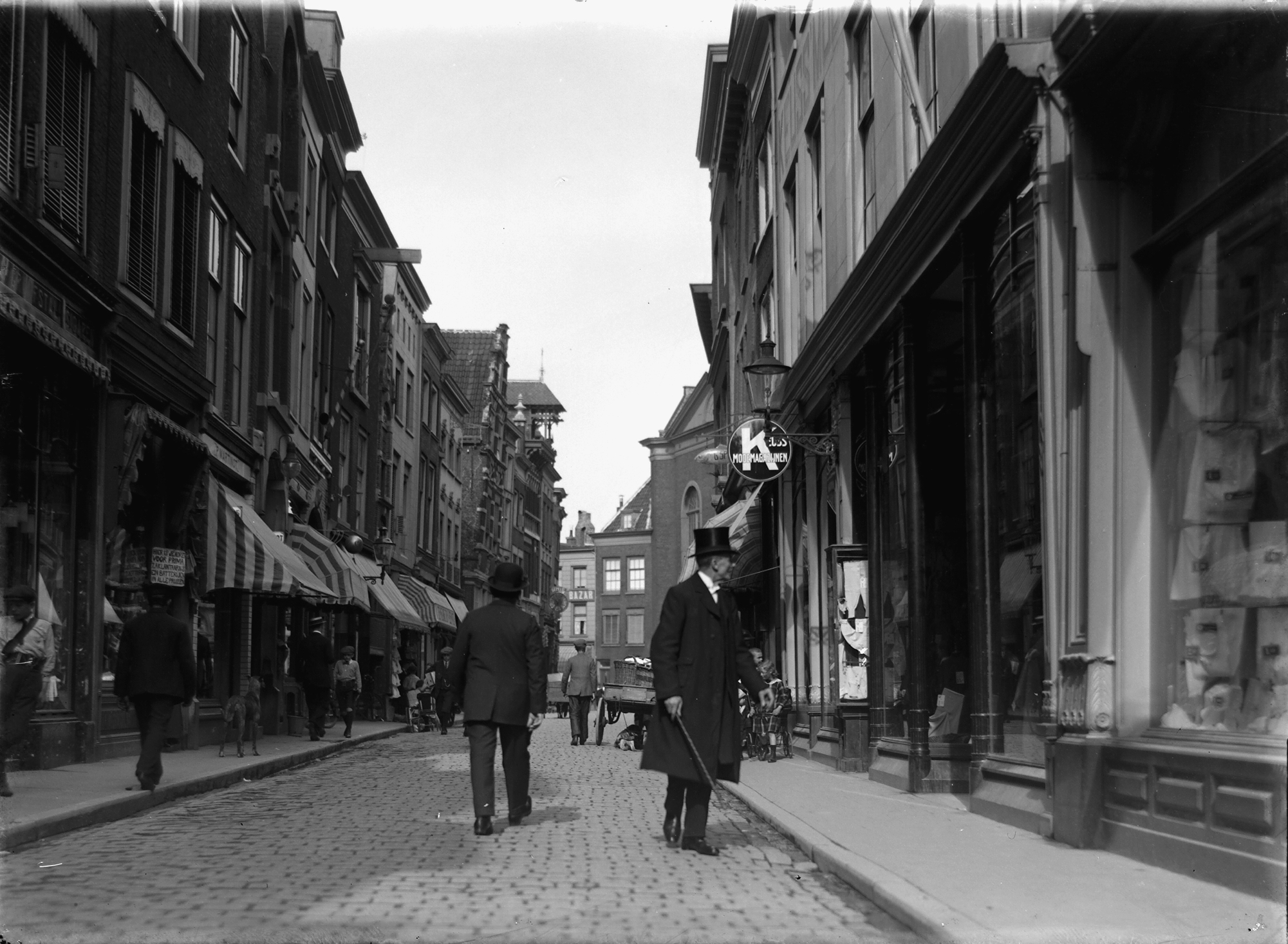 - hoeden hondenkarren voetgangers winkels zonweringen