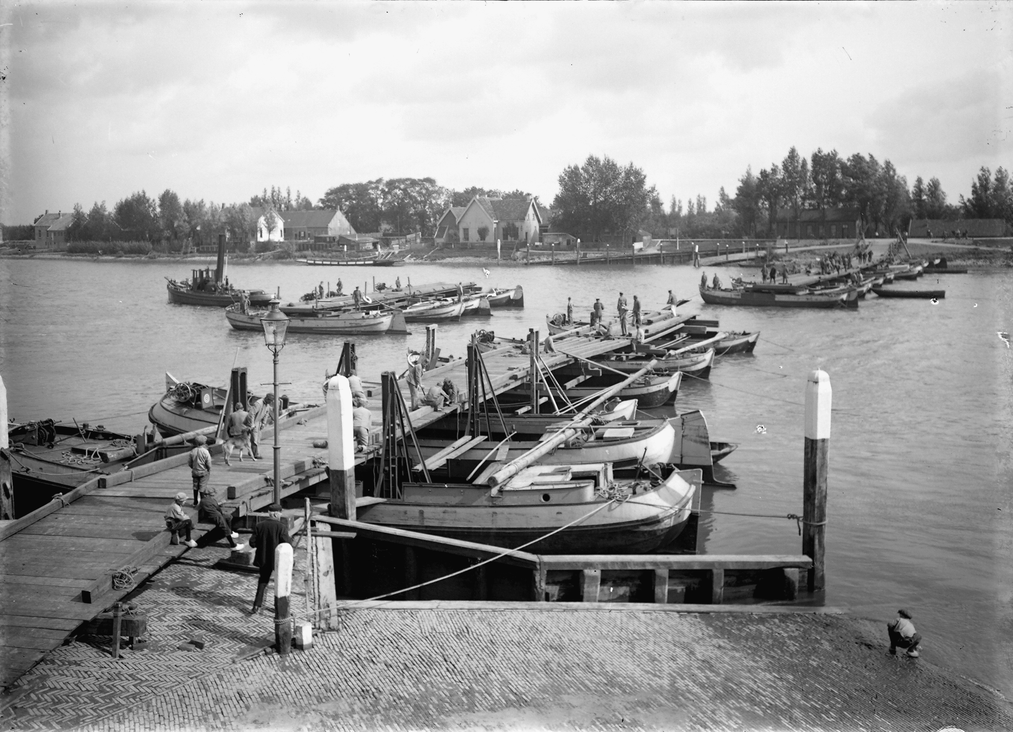 - Pontonniers bij de veersteiger in 's-Gravendeel bouwen een pontonbrug over de Dordsche Kil naar Wieldrecht .