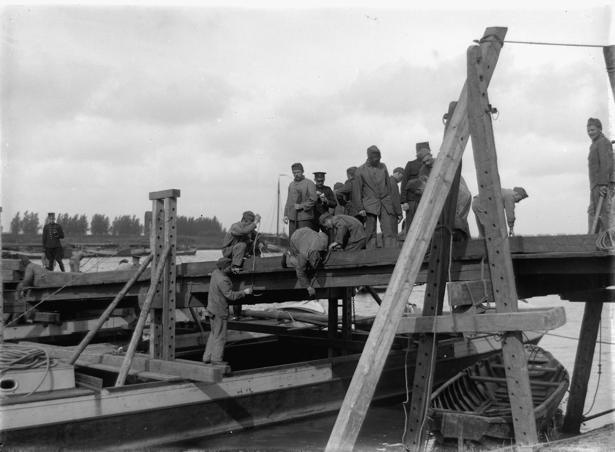 - Pontonniers bij de veersteiger in Wieldrecht. Aan de overzijde van de Dordtsche Kil ligt 's-Gravendeel.