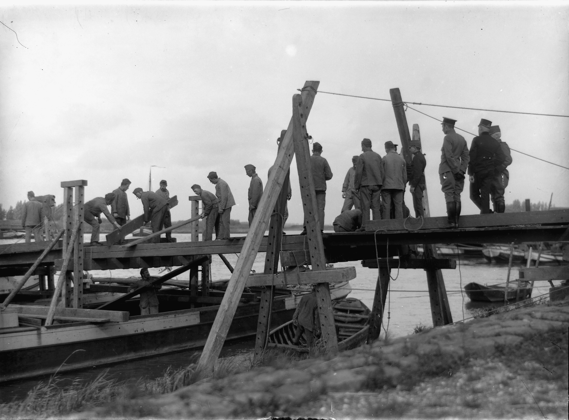 - Pontonniers bij de pontonbrug over de Dordtsche Kil vanuit de Hoekse Waard ten zuiden van 's-Gravendeel naar het zuidoosten, het Eiland van Dordrecht.