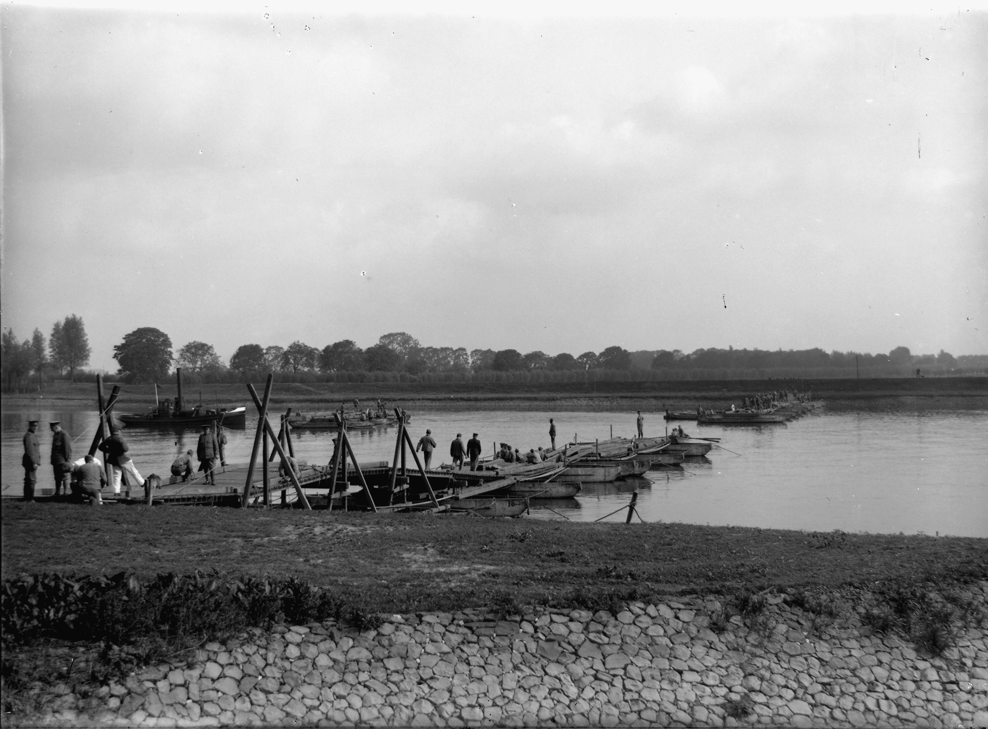 - Pontonniers bij de pontonbrug over de Dordtsche Kil vanuit de Hoekse Waard ten zuiden van 's-Gravendeel naar het oosten, het Eiland van Dordrecht.