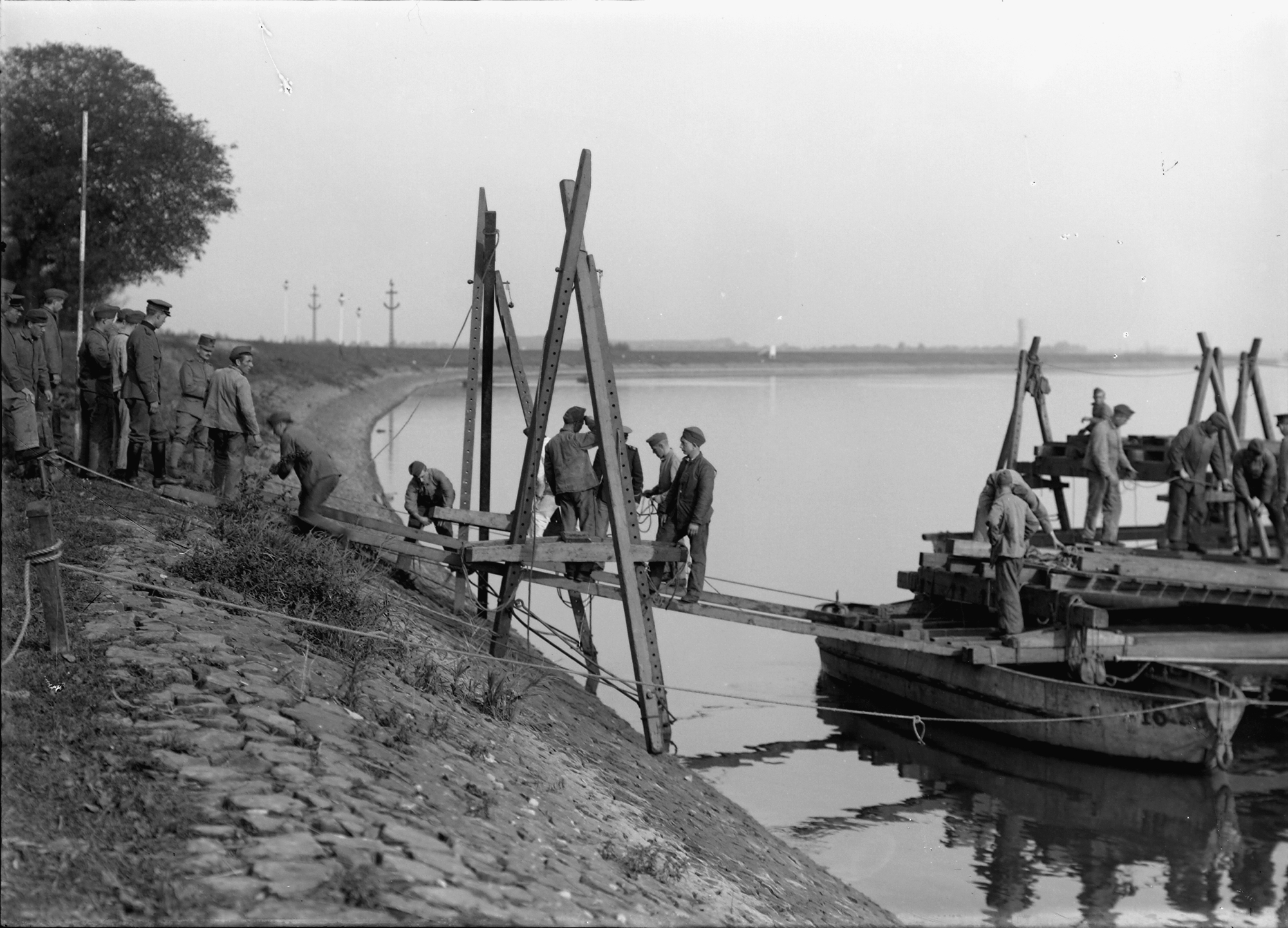Pontonniers langs de Dordtsche Kil in de Hoeksche Waard ten zuiden van 's-Gravendeel. …