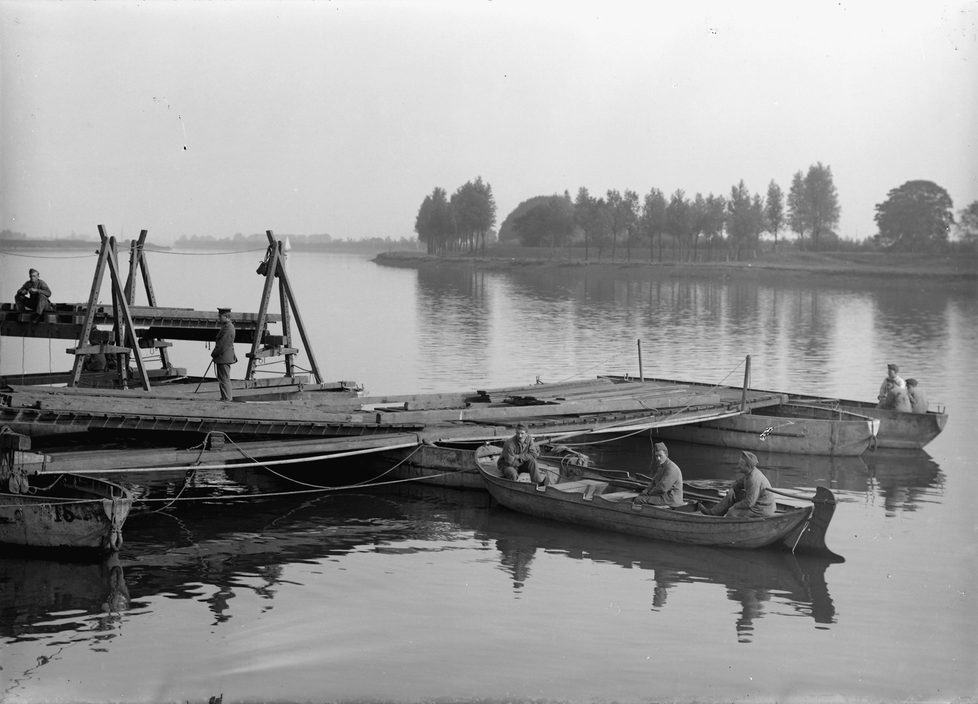 Pontonniers langs de Dordtsche Kil in de Hoeksche Waard ten zuiden van 's-Gravendeel. …