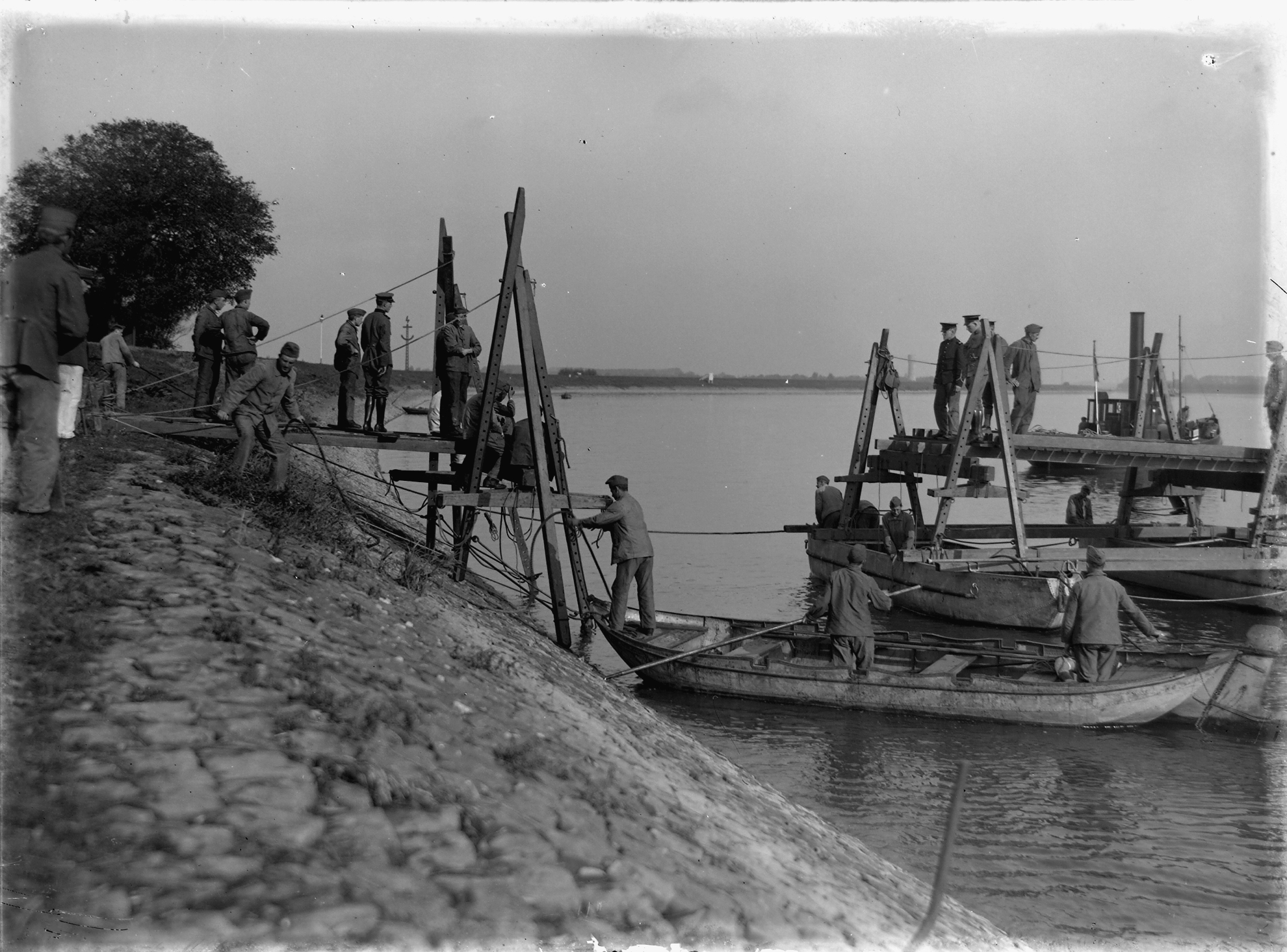 Pontonniers langs de Dordtsche Kil in de Hoeksche Waard ten zuiden van 's-Gravendeel. …