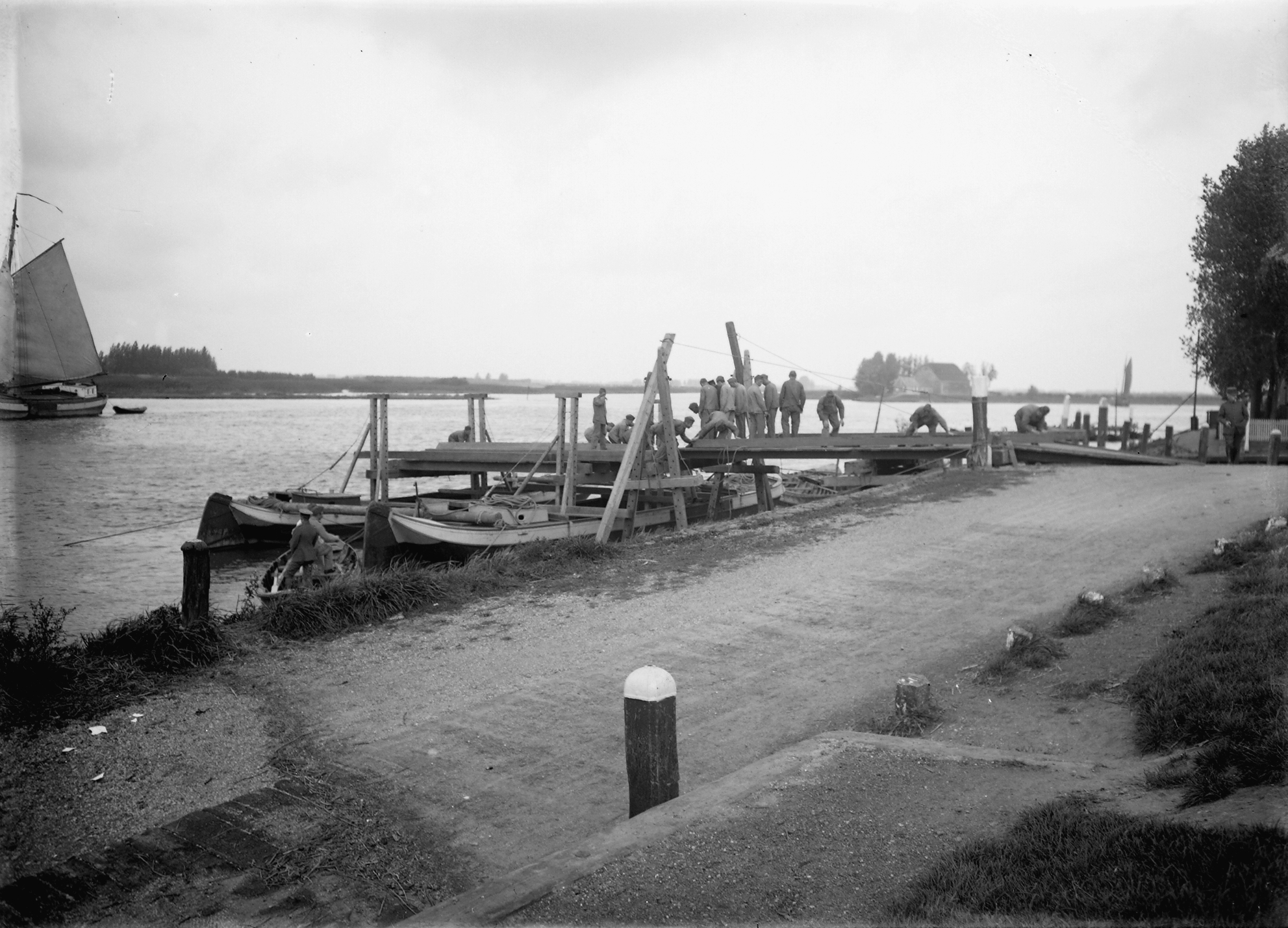 Pontonniers bij de veersteiger in Wieldrecht. Aan de overzijde van de Dordtsche Kil …