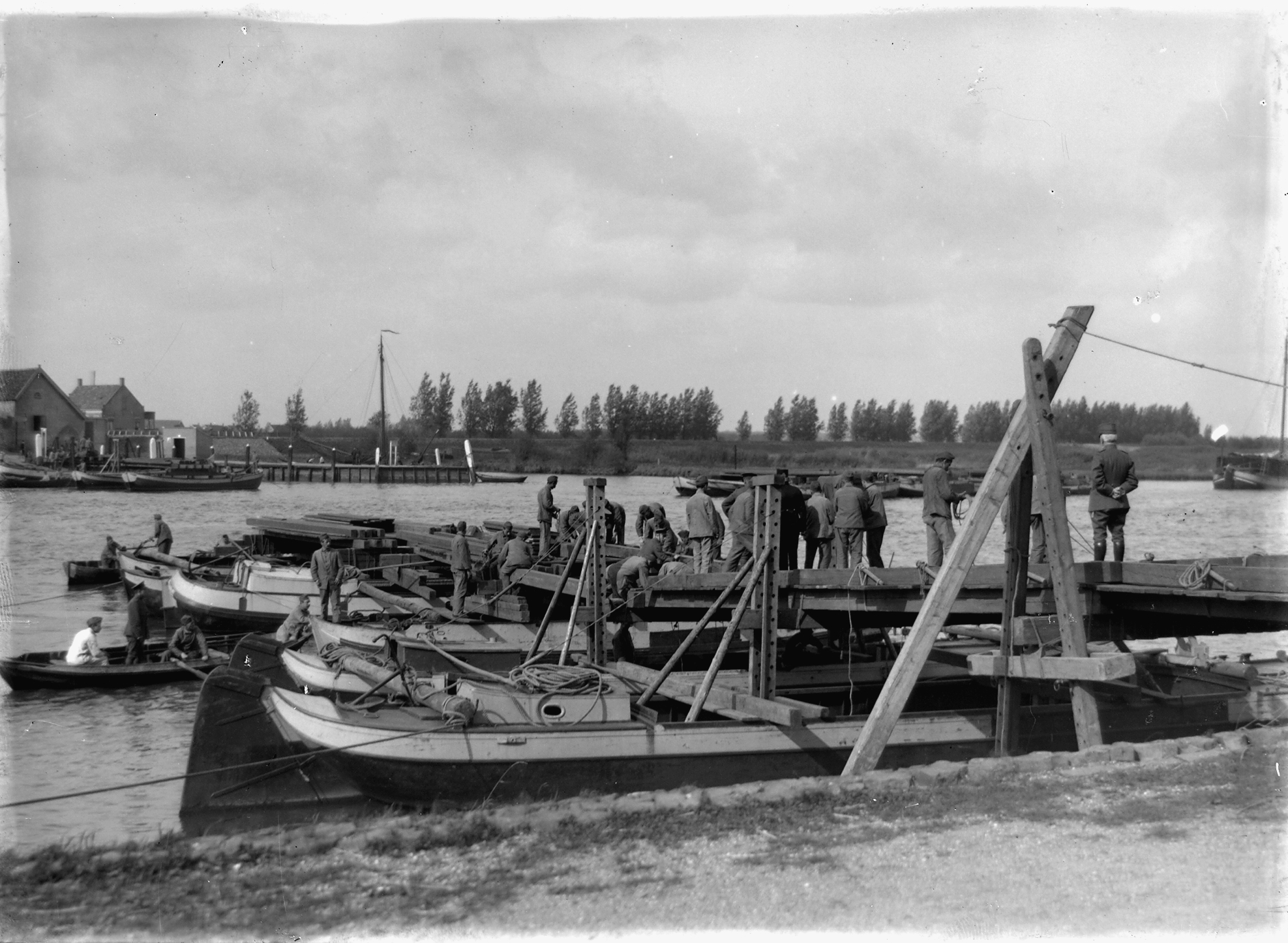 - Pontonniers bij de veersteiger in Wieldrecht. Aan de overzijde van de Dordtsche Kil ligt 's-Gravendeel.