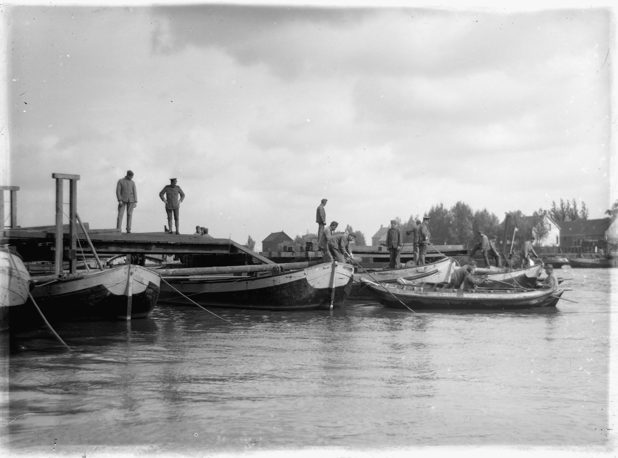 Pontonniers bij de veersteiger in 's-Gravendeel. Aan de overzijde van de Dordtsche Kil …