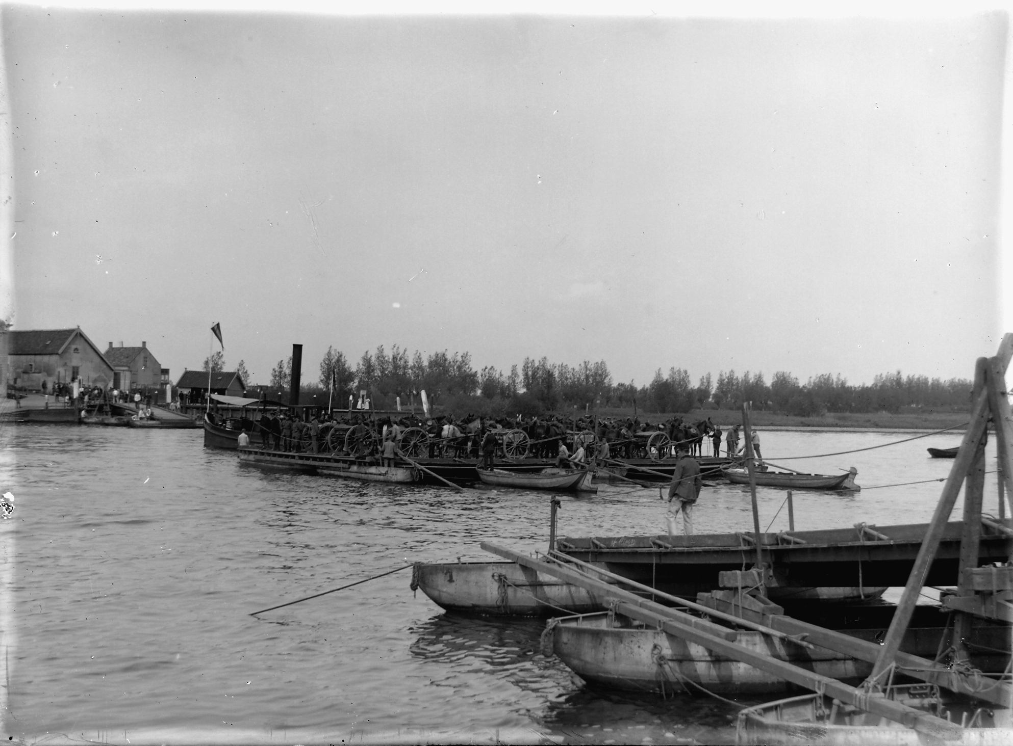 - Pontonniers bij de veersteiger in Wieldrecht. Aan de overzijde van de Dordtsche Kil ligt de veersteiger van 's-Gravendeel.