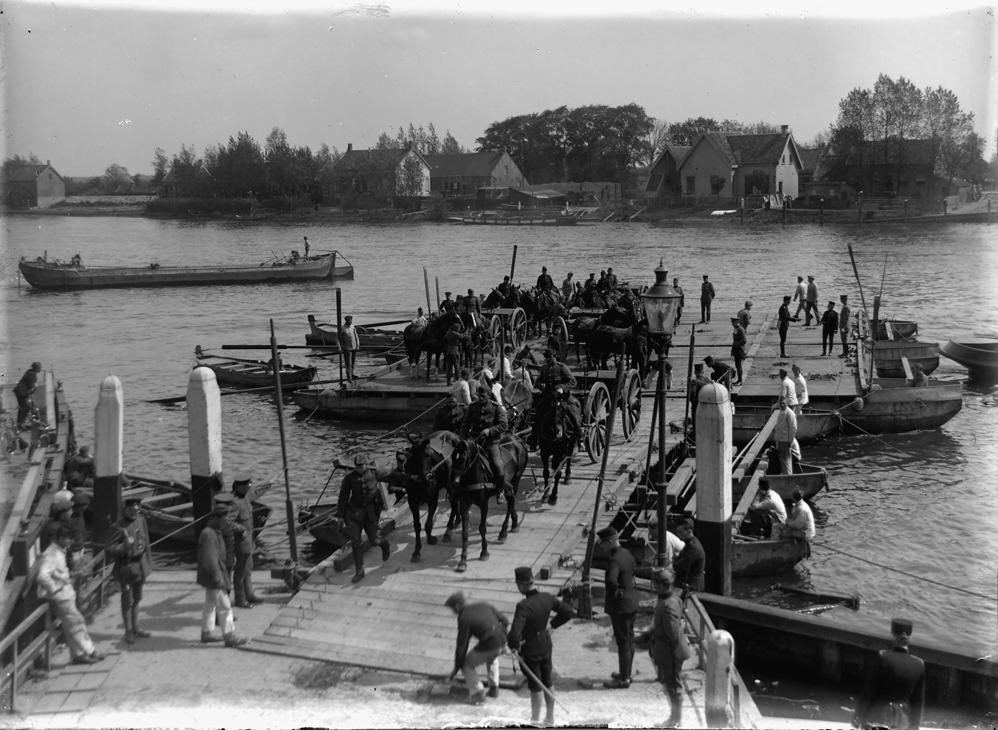 Pontonniers bij de veersteiger in 's-Gravendeel. Aan de overzijde van de Dordtsche Kil …