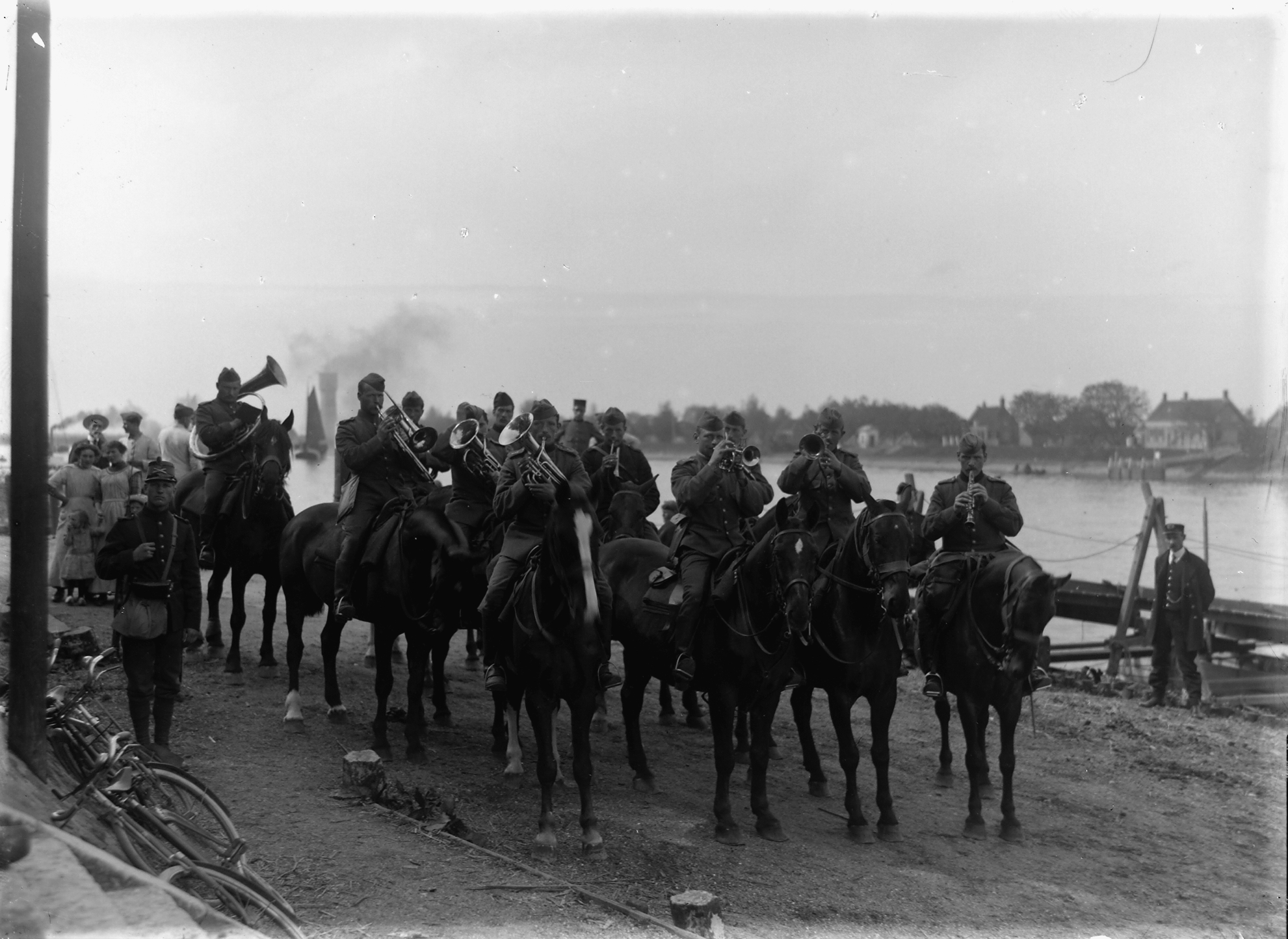 - Musicerende militairen te paard bij de veersteiger in Wieldrecht. Aan de overzijde van de Dordtsche Kil ligt 's-Gravendeel.