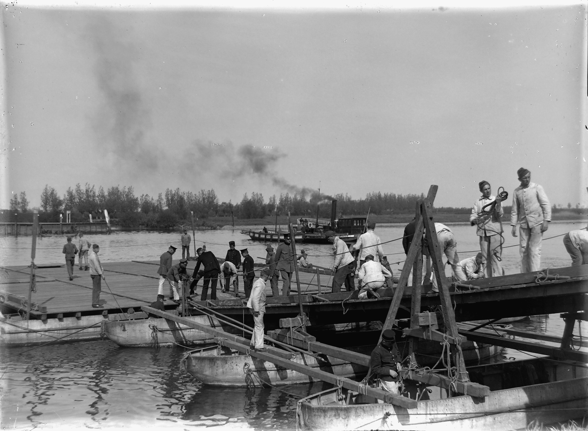 - Pontonniers bij de veersteiger in Wieldrecht. Aan de overzijde van de Dordtsche Kil ligt 's-Gravendeel.