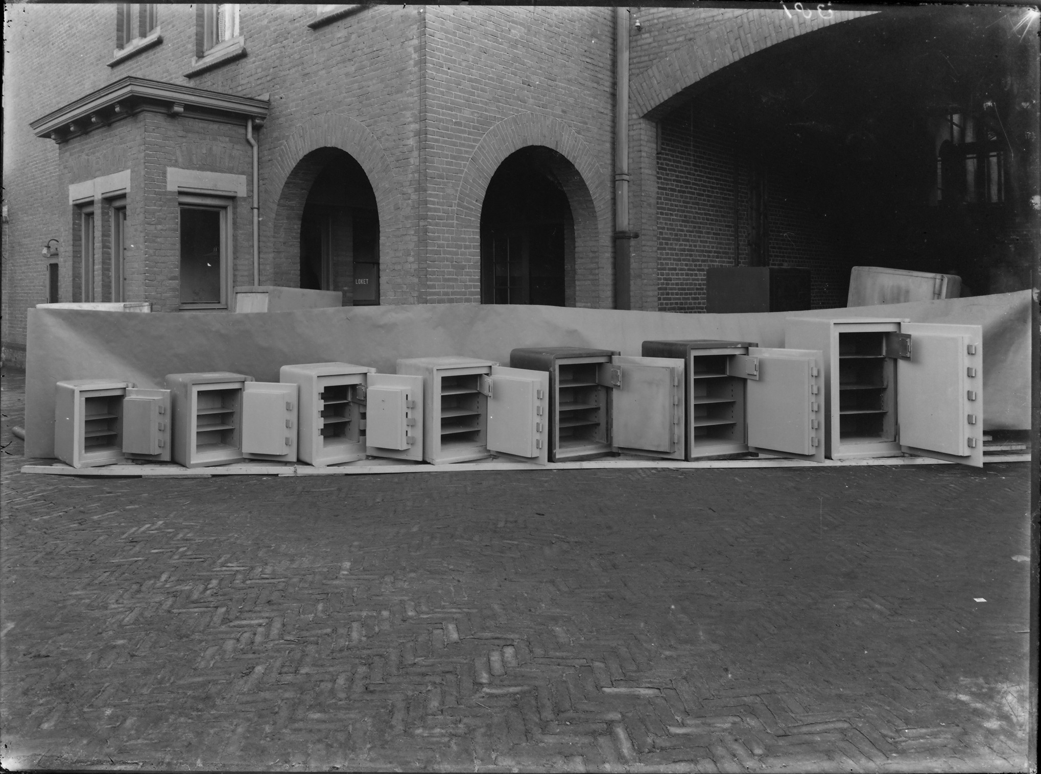 Opstelling van een serie brandkasten opgesteld in de Lips brandkastenfabriek aan de Spuiweg.