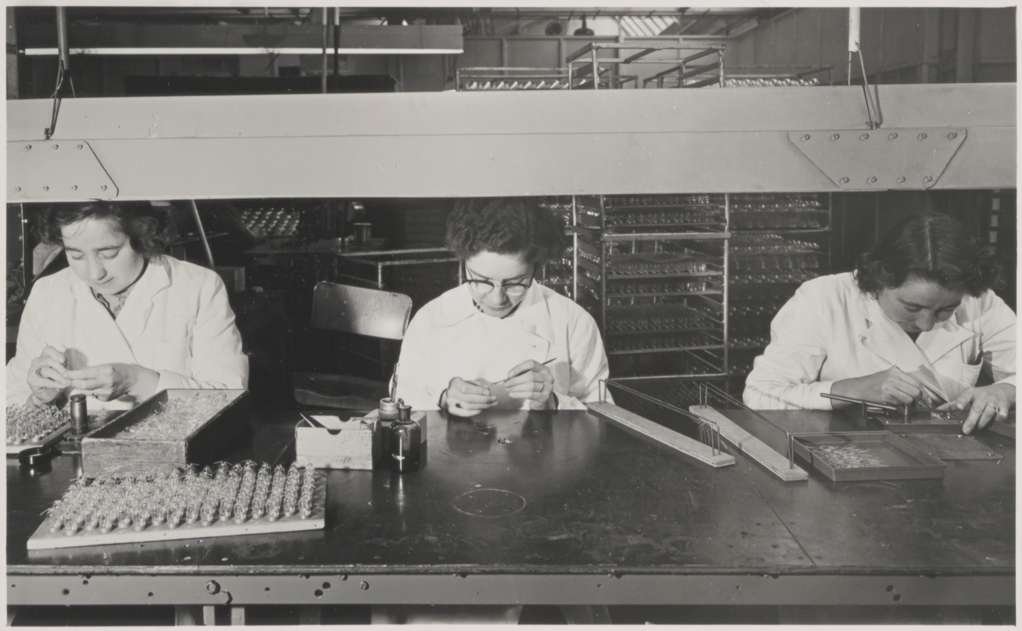 Lampenafdeling. Op de foto is te zien hoe fietslampen gemaakt worden.