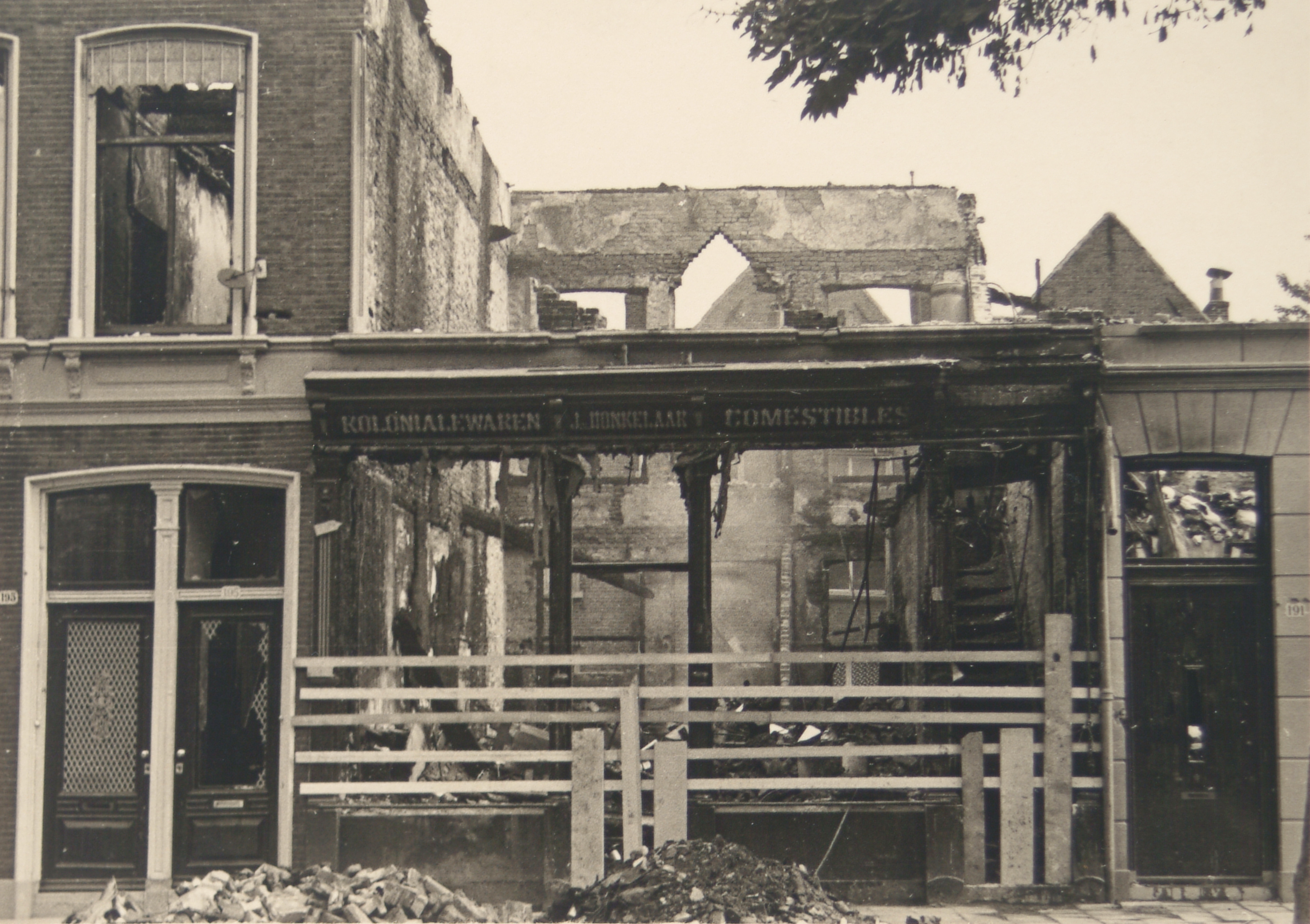 Oorlogsschade aan huizen aan de Albert Cuypsingel