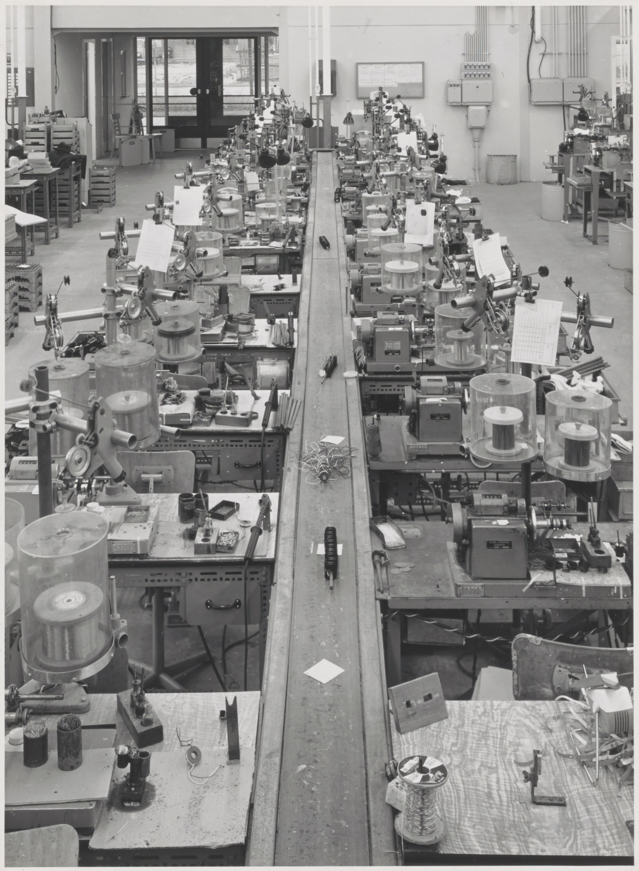 Lopende band in een montagehal. Op de band zie je de spoelen liggen voor diversen …