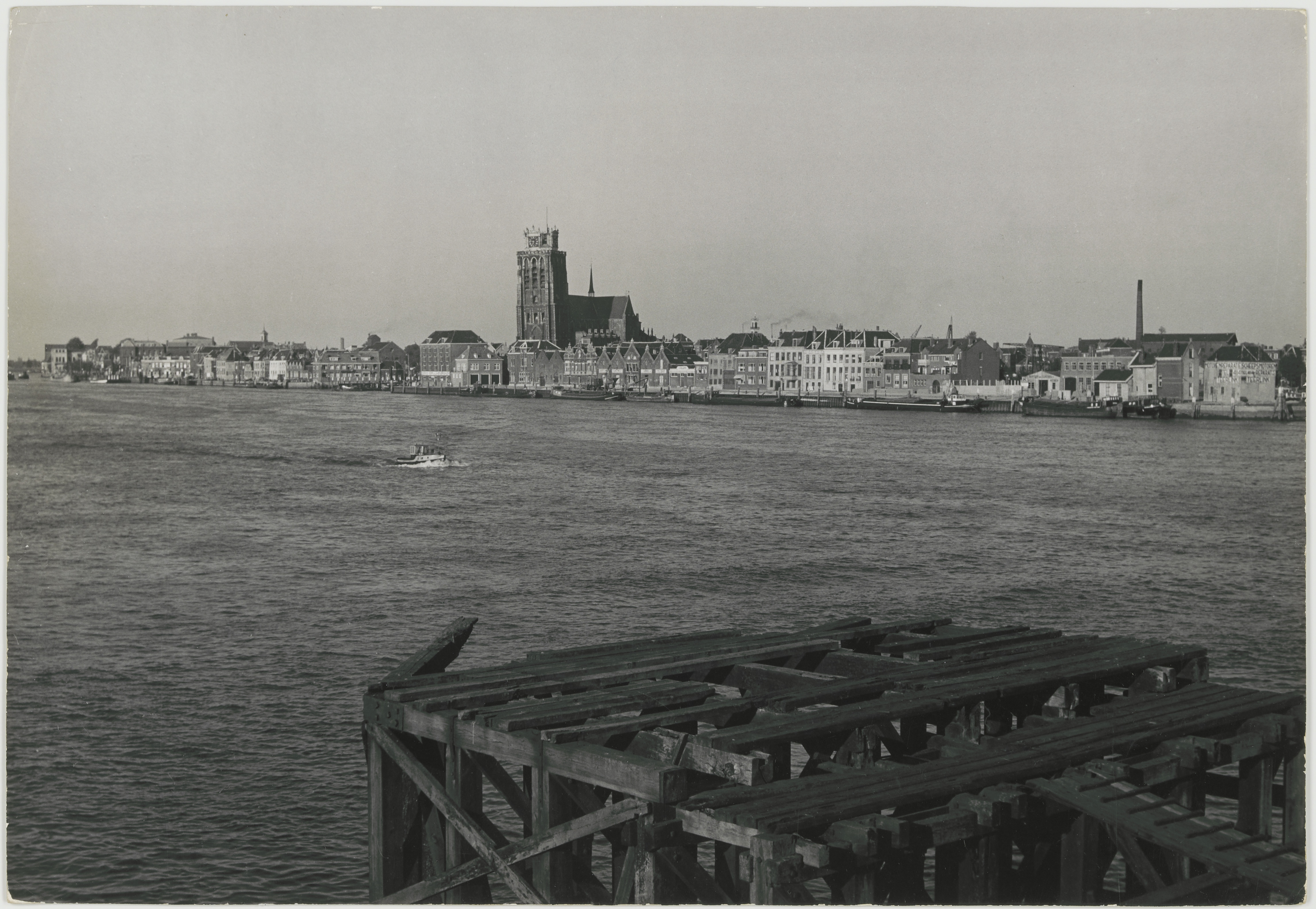 - V.l.n.r. Buiten Walevest, Zwijndrechts veer, pakhuis Vredenburg op de hoek Bomhaven/Hooikade, Grote Kerk en Buiten Kalkhaven, gezien vanaf de spoorbrug over de Oude Maas.