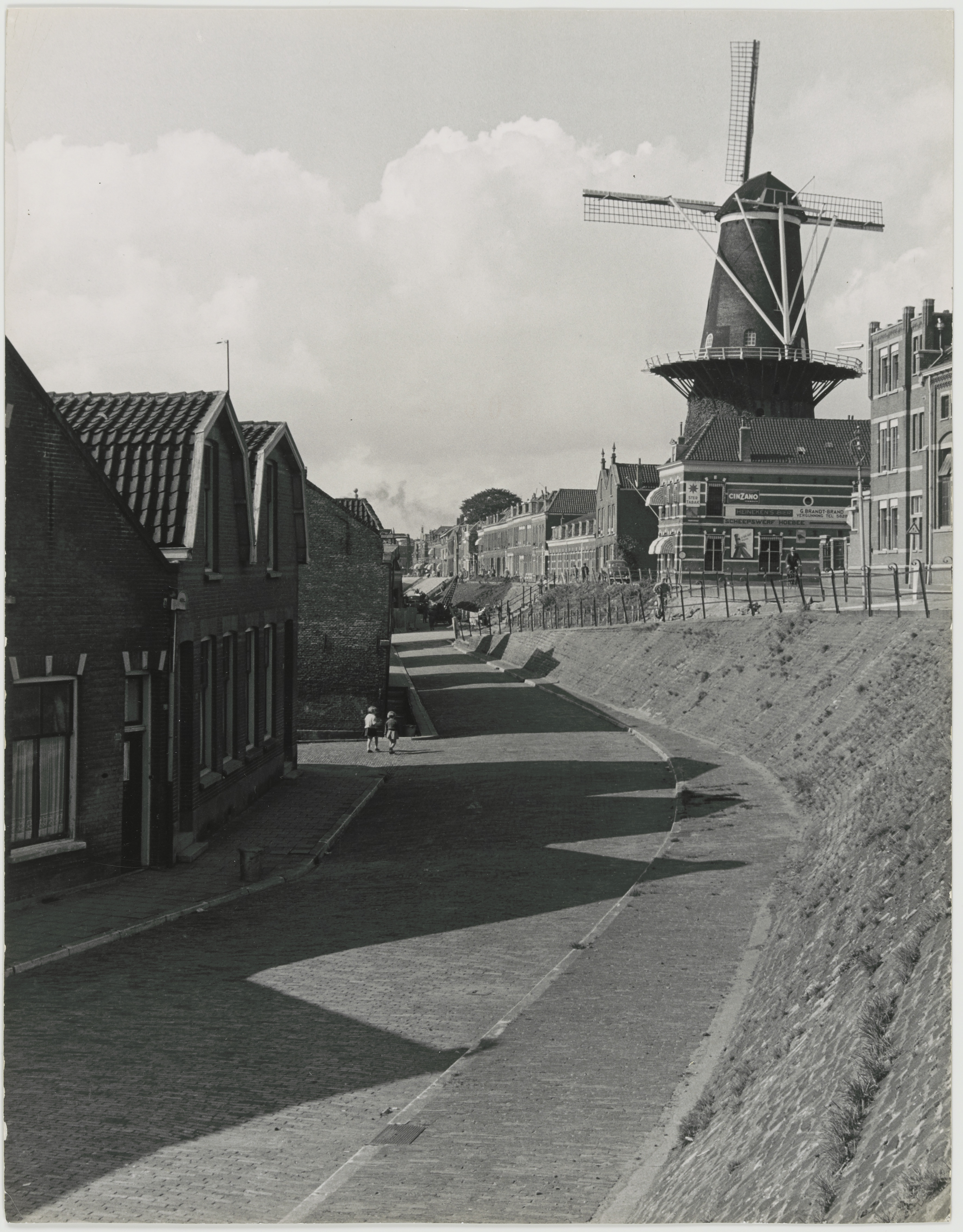 - De Noordendijk vanaf het energiebedrijf op de hoek van de Biesboschstraat met café Brandt richting molen Kijck over den Dijck. In het midden naar links is de Tweede Dijkstraat.