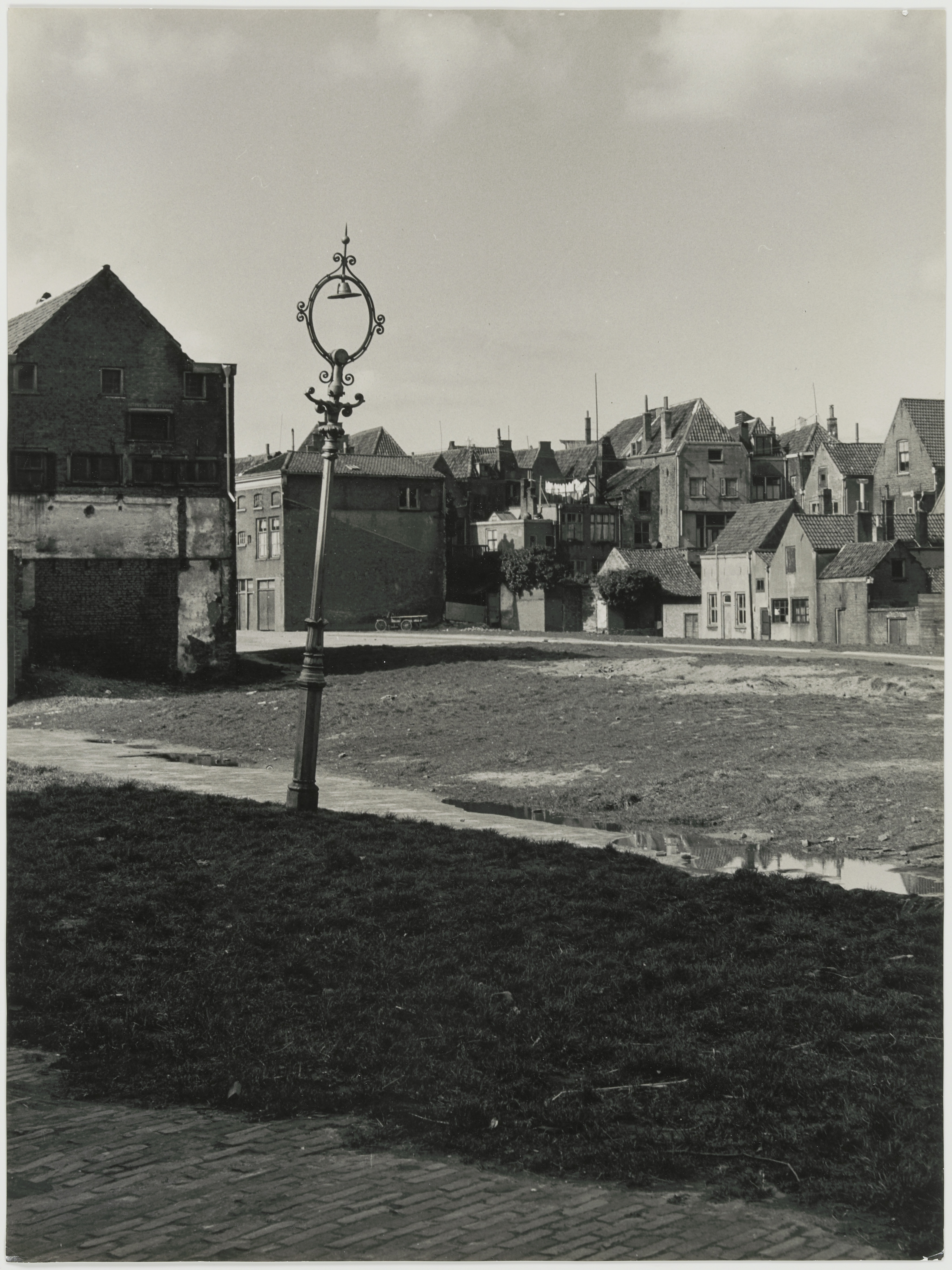 - Braakliggend terrein waarop huizen in de Torenstraat stonden, gezien vanaf het Nieuwkerksplein in westelijke richting. Huizen geheel rechts staan in de Pompstraat die eindigde tegen de achterkant van de huizen in de Voorstraat (achtergrond rechts).