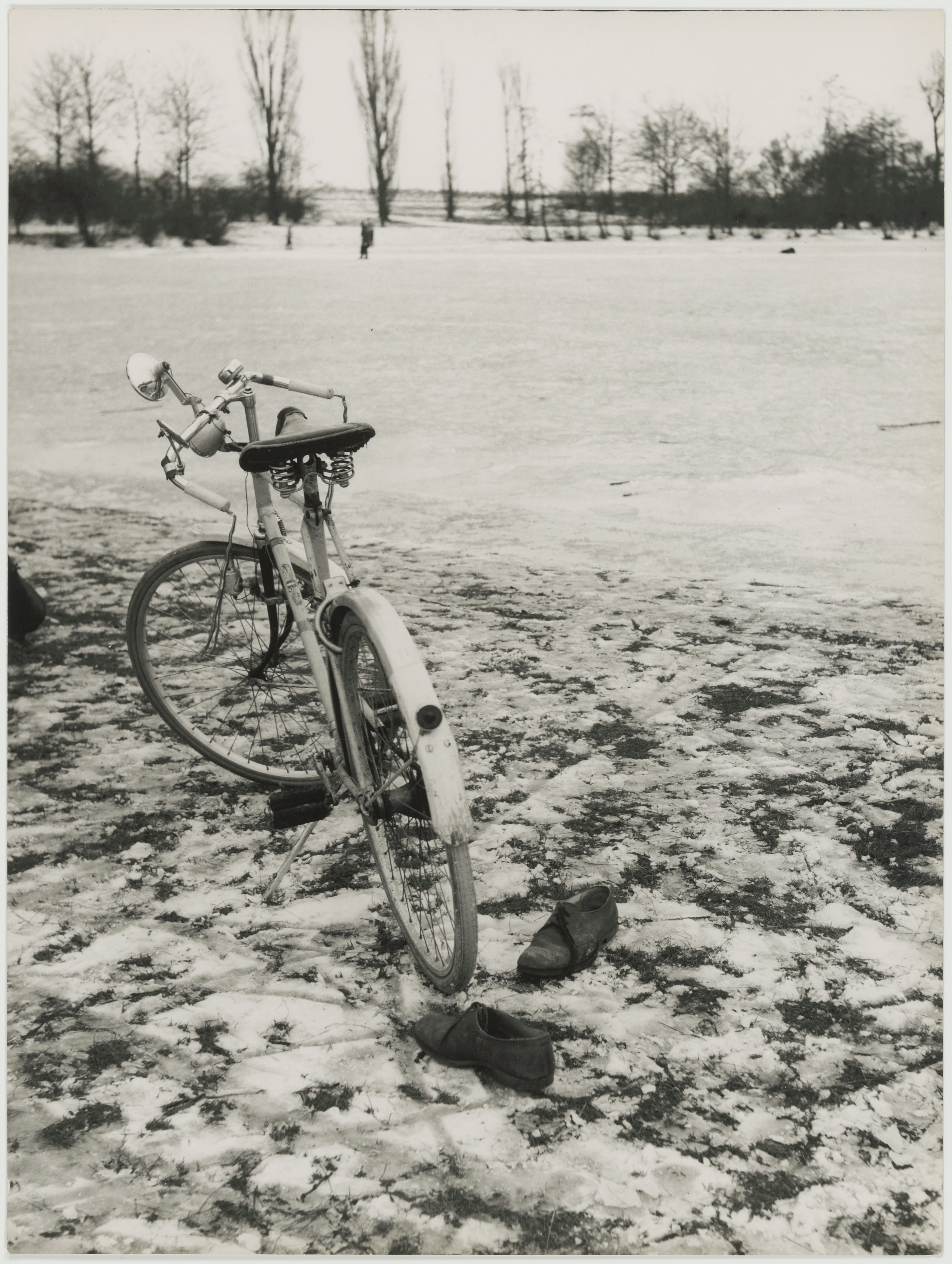 Iemand die graag schaatst laat fiets en schoenen achter bij een vijver in het Wantijpark.