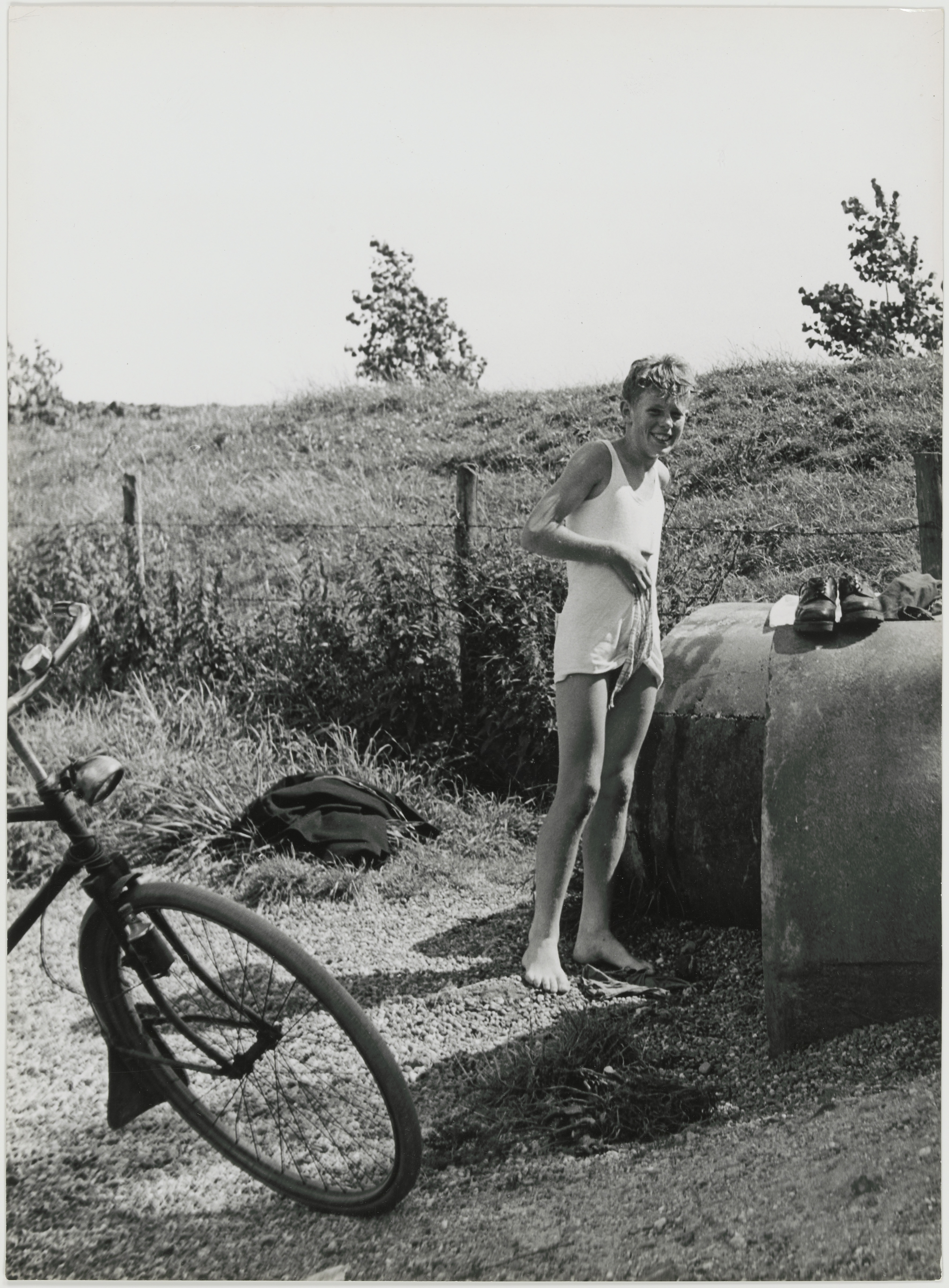 - Jan Lughart droogt zich af na het zwemmen tijdens een fietstochtje naar de Loswal.