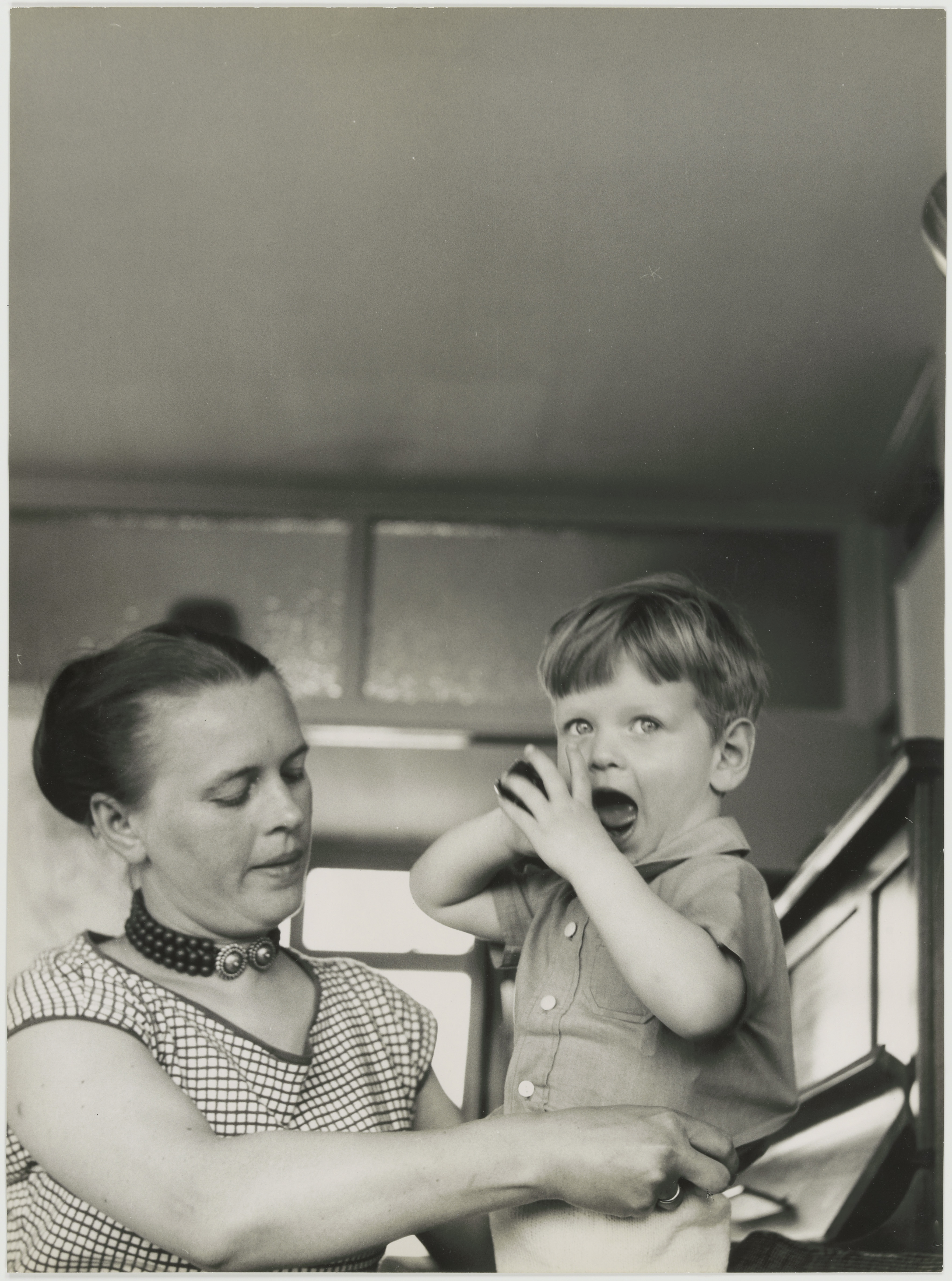 - Moeder kleedt zoontje aan.