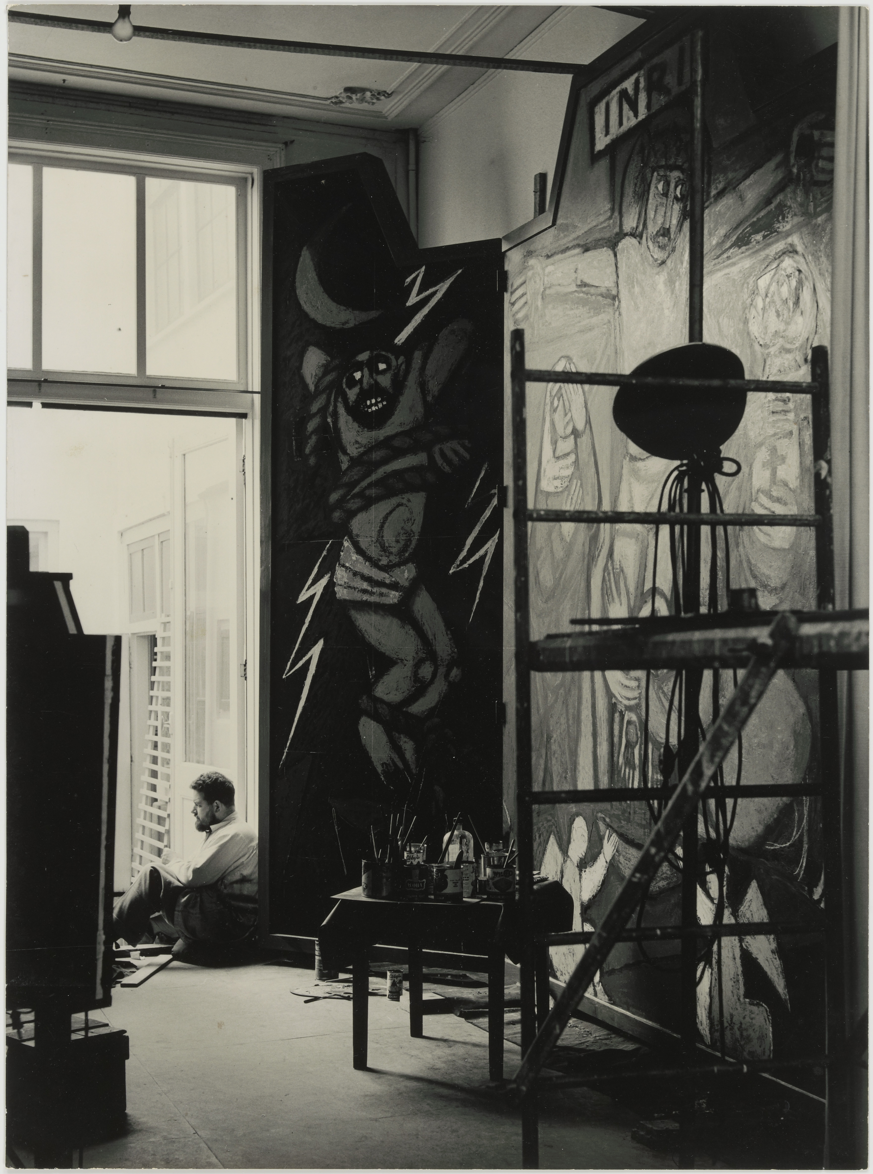 Beeldend kunstenaar Anthonius Henricus (Toon) Winkel (Rotterdam 30-05-1923, Wouw 1989) in het atelier in de Gravenstraat.