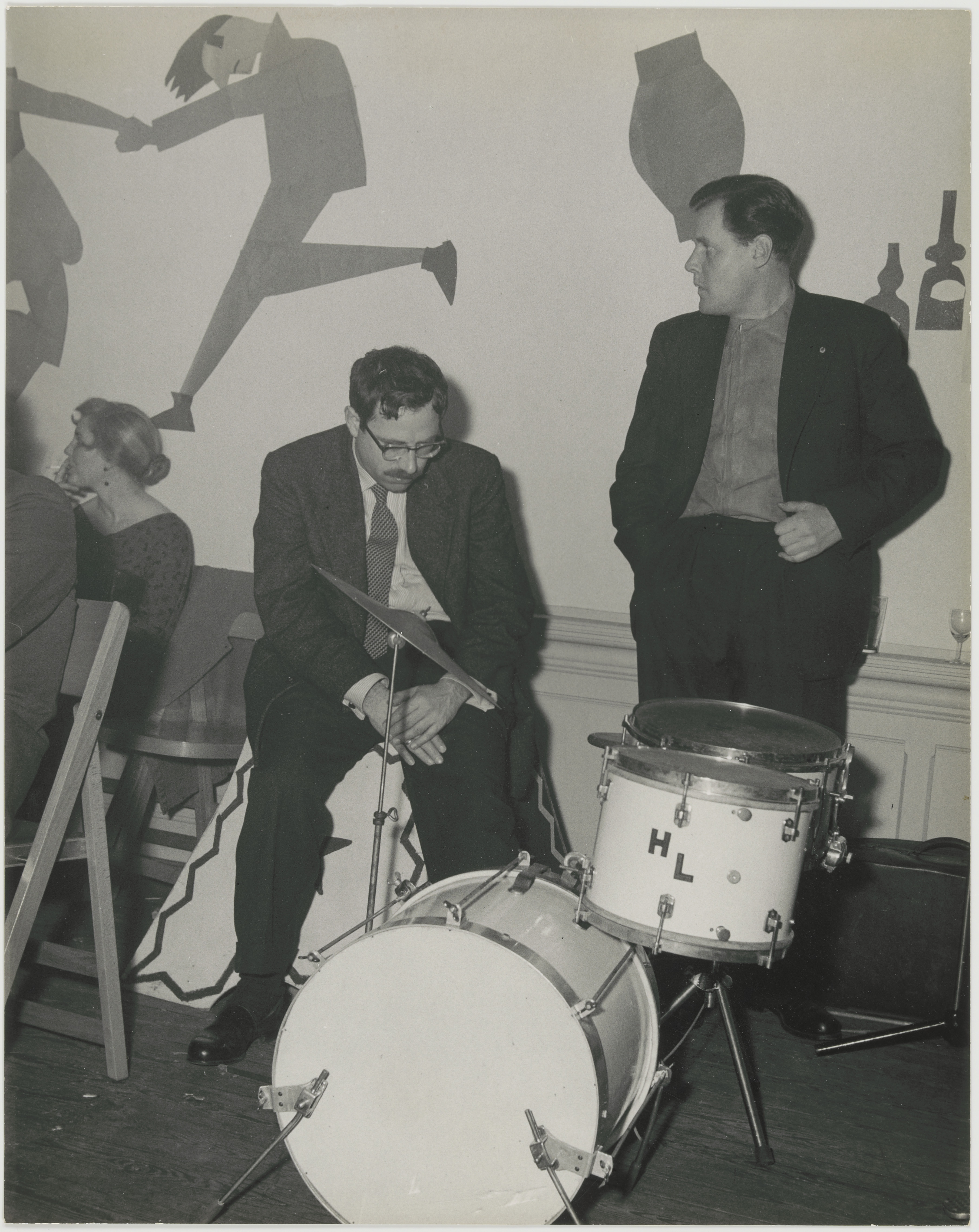 - Schrijver Kees Buddingh' in gepeins verzonken zittend achter een drumstel, naast hem architect Jan Dicke op een feest van tekengenootschap Pictura.