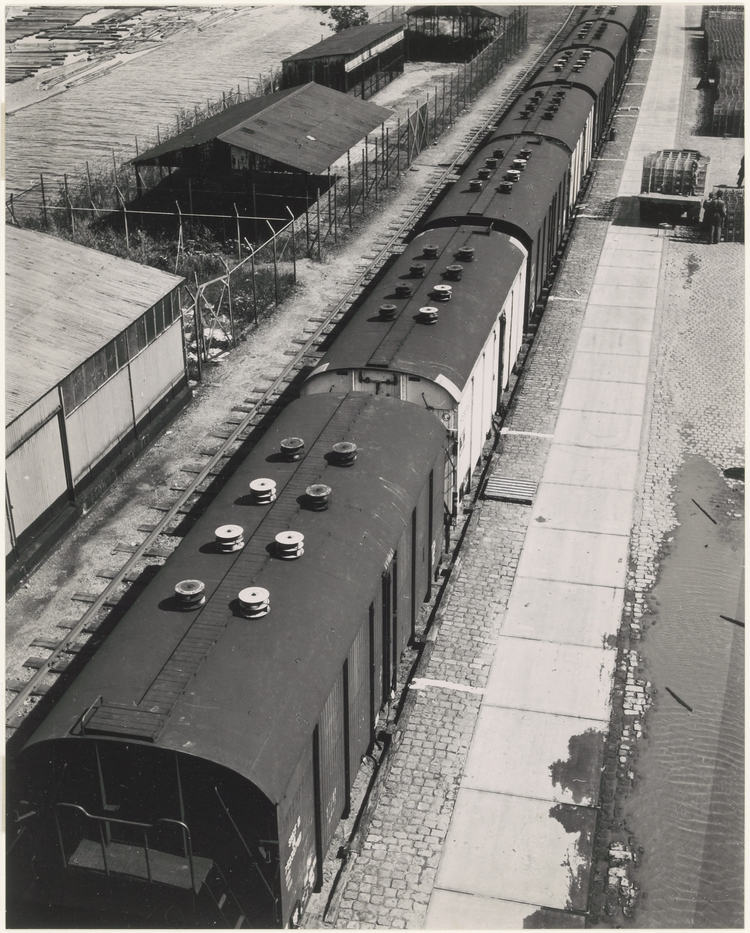 Genomen vanaf de verkeersbrug. Koelwagons en bergen stalen melkkratten welke door Sterovita benodigd waren voor de levering van melk en yoghurt aan het Amerikaanse leger in Duitsland.