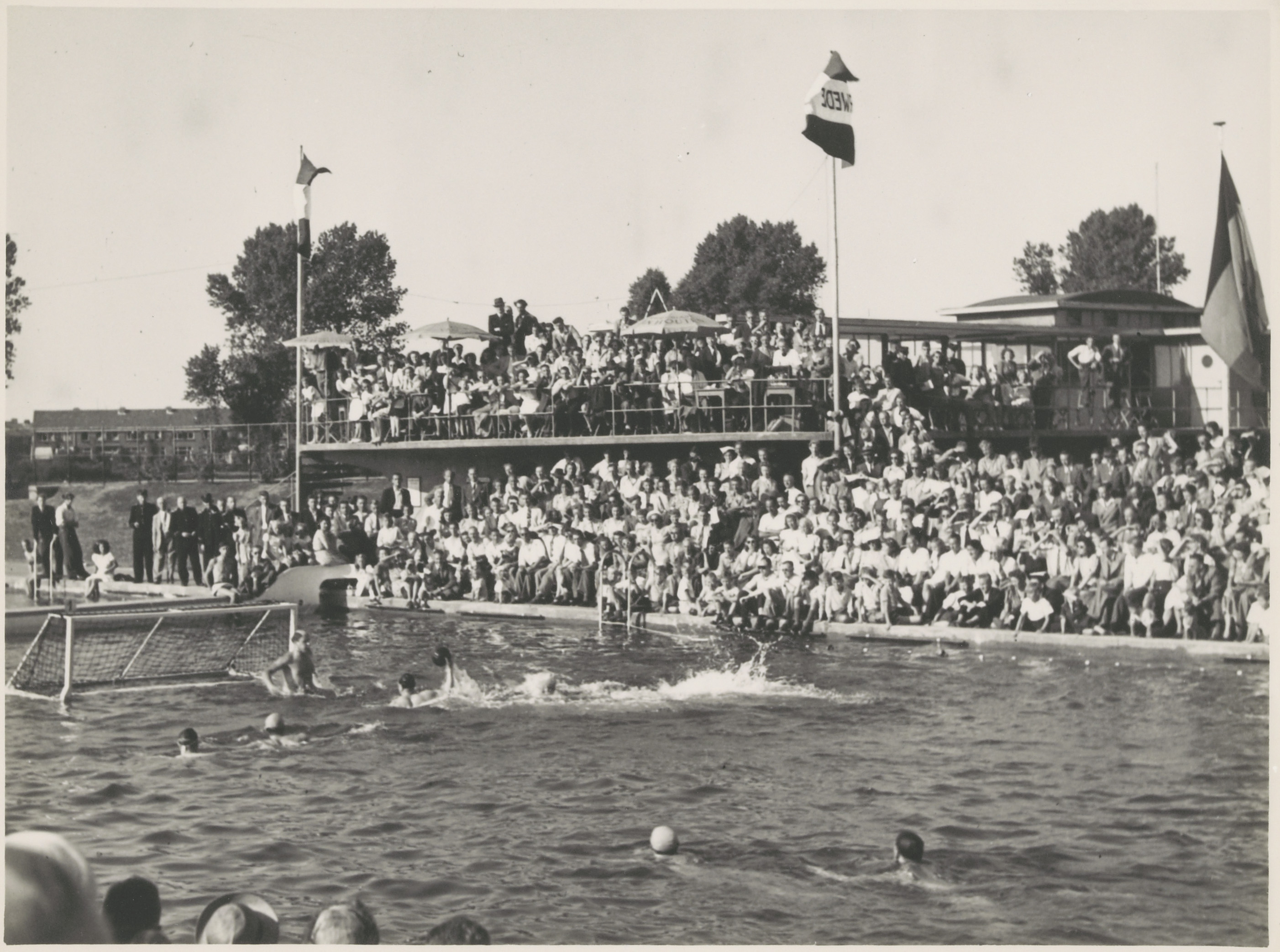 - Waterpolowedstrijd in het Wantijbad. Links op de achtergrond de Maasstraat.