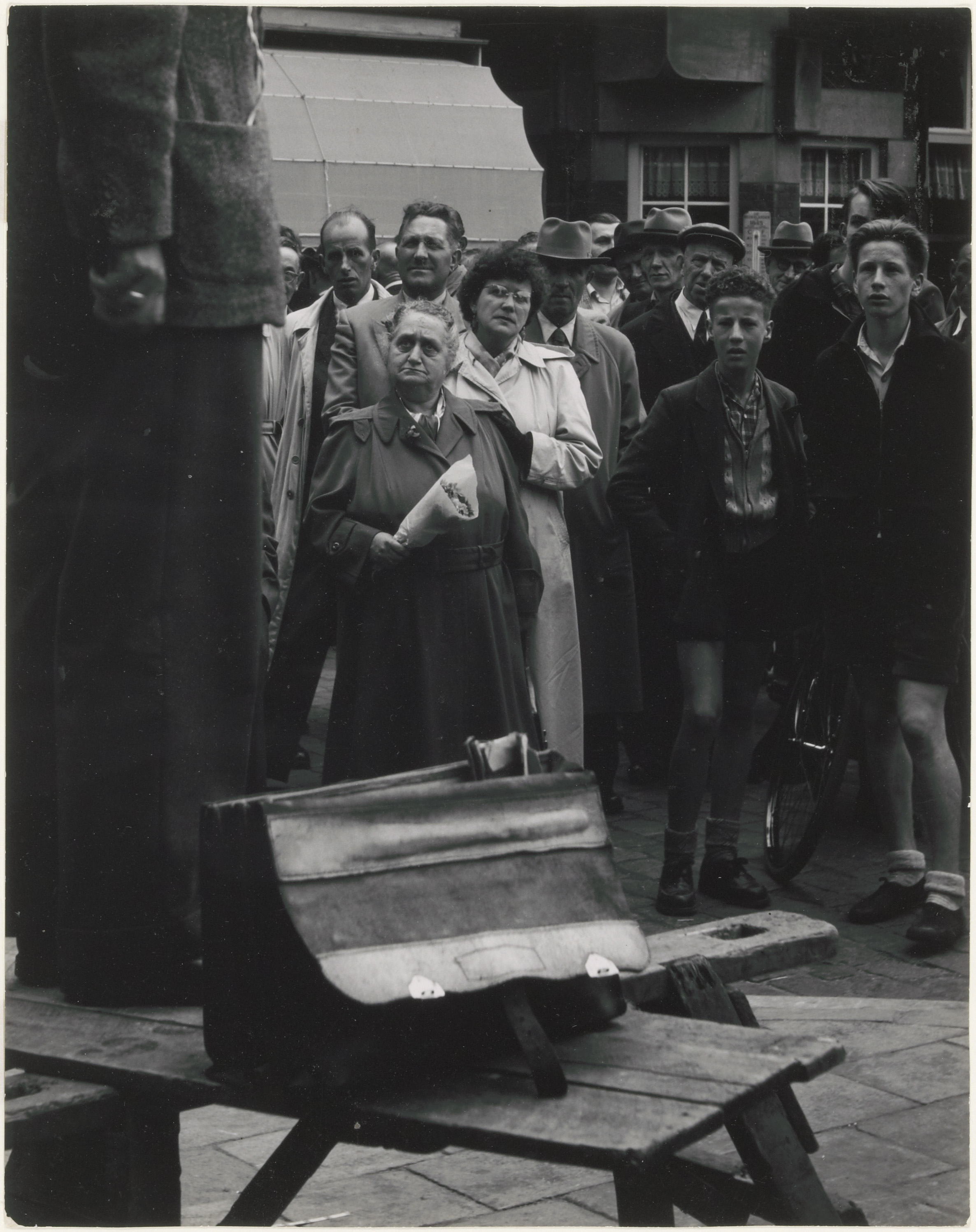 - Toehoorders bij een spreker aan de westkant van het Scheffersplein, gezien in de richting van de Tolbrugstraat Waterzijde.