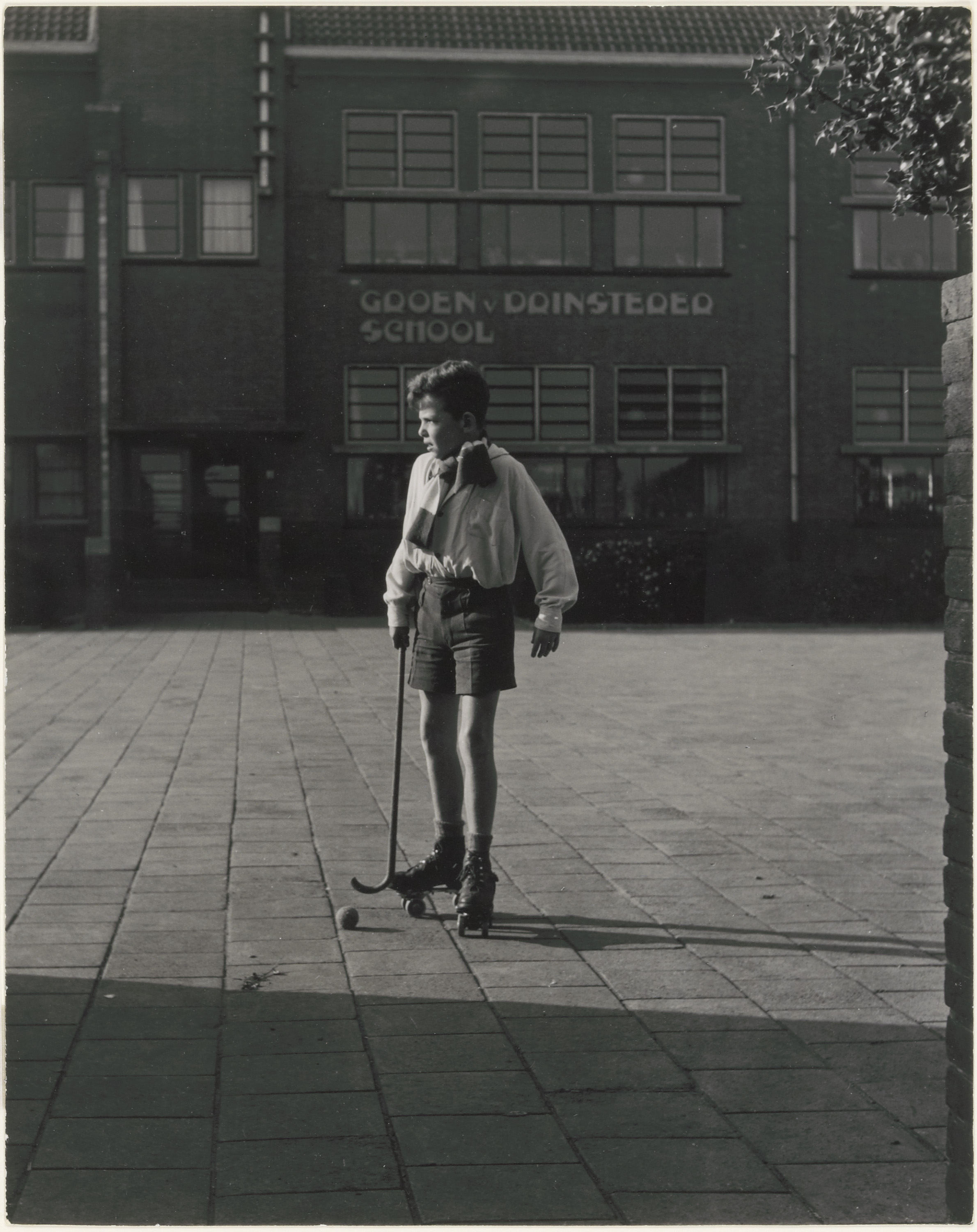 - Jongen speelt rolhockey met een wandelstok op het schoolplein van de Groen van Prinstererschool in de Standhasenstraat.
