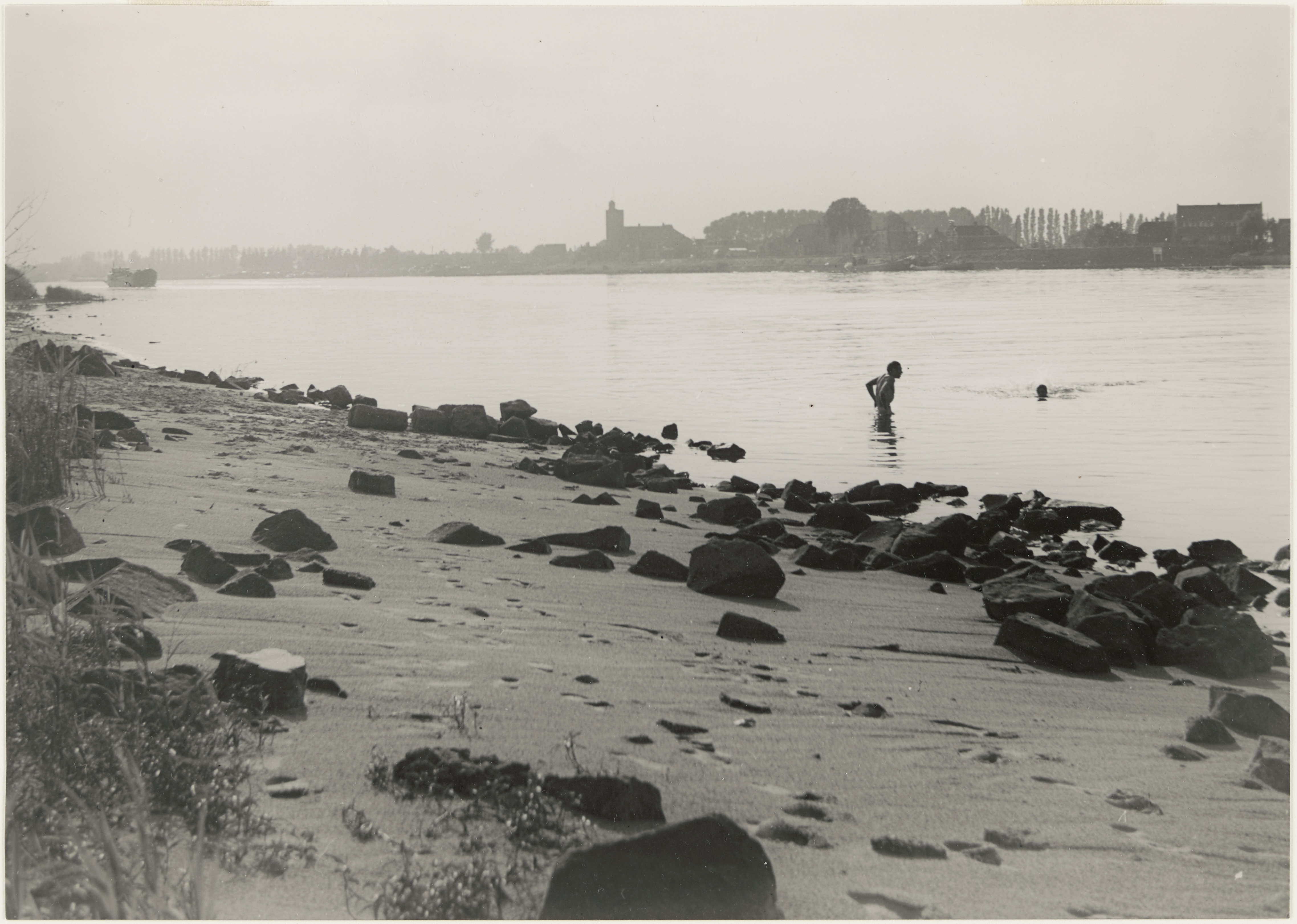 Zwemmers in de Beneden Merwede met de NH kerk voor de terugrenovatie aan de Kerkbuurt …