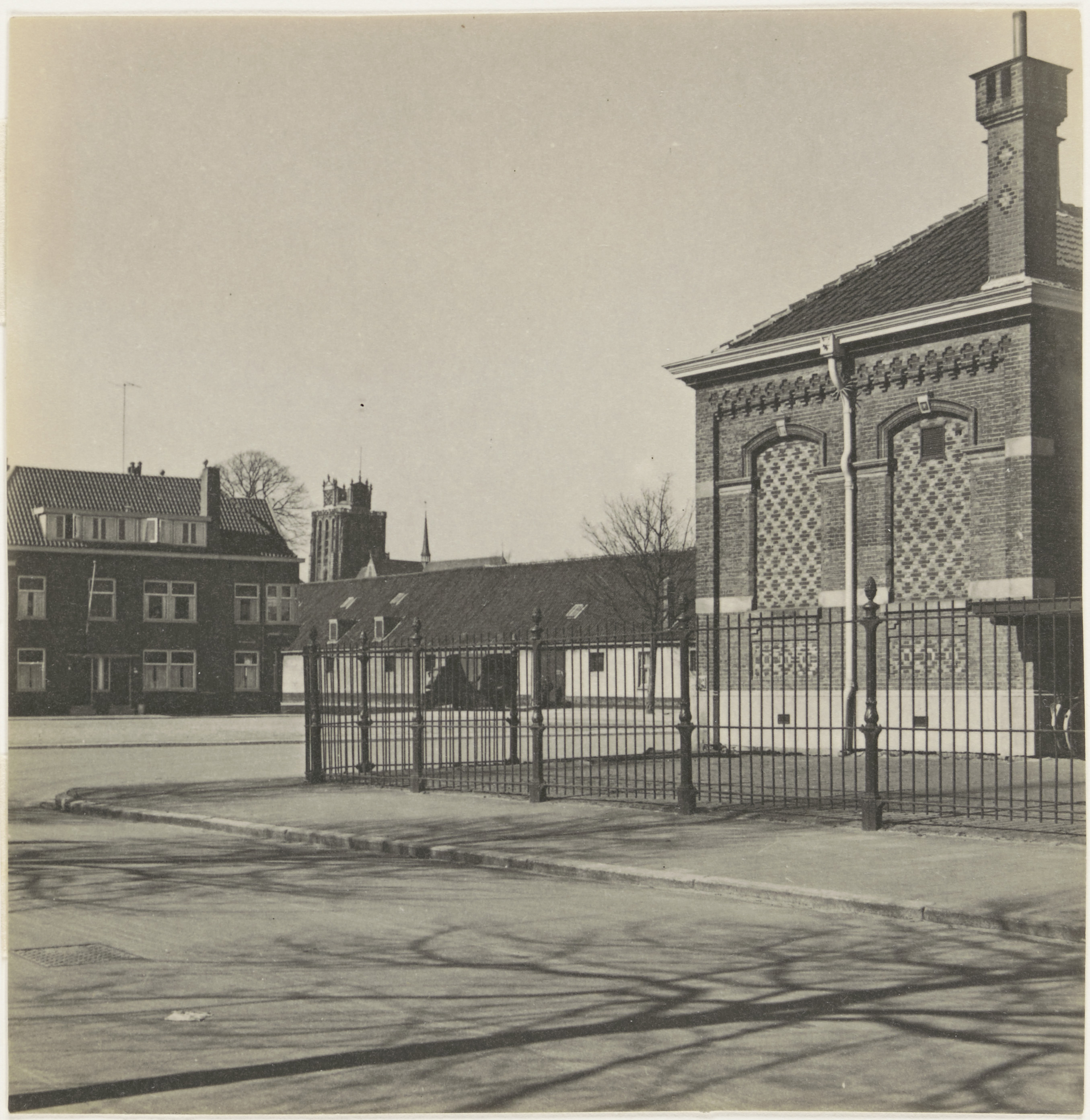 - Achterkant van het gymnasium vanaf het Beverwijcksplein met zicht op rijksmagazijn de Lange Loods in de Cornelis de Wittstraat en op de Grote Kerk.
