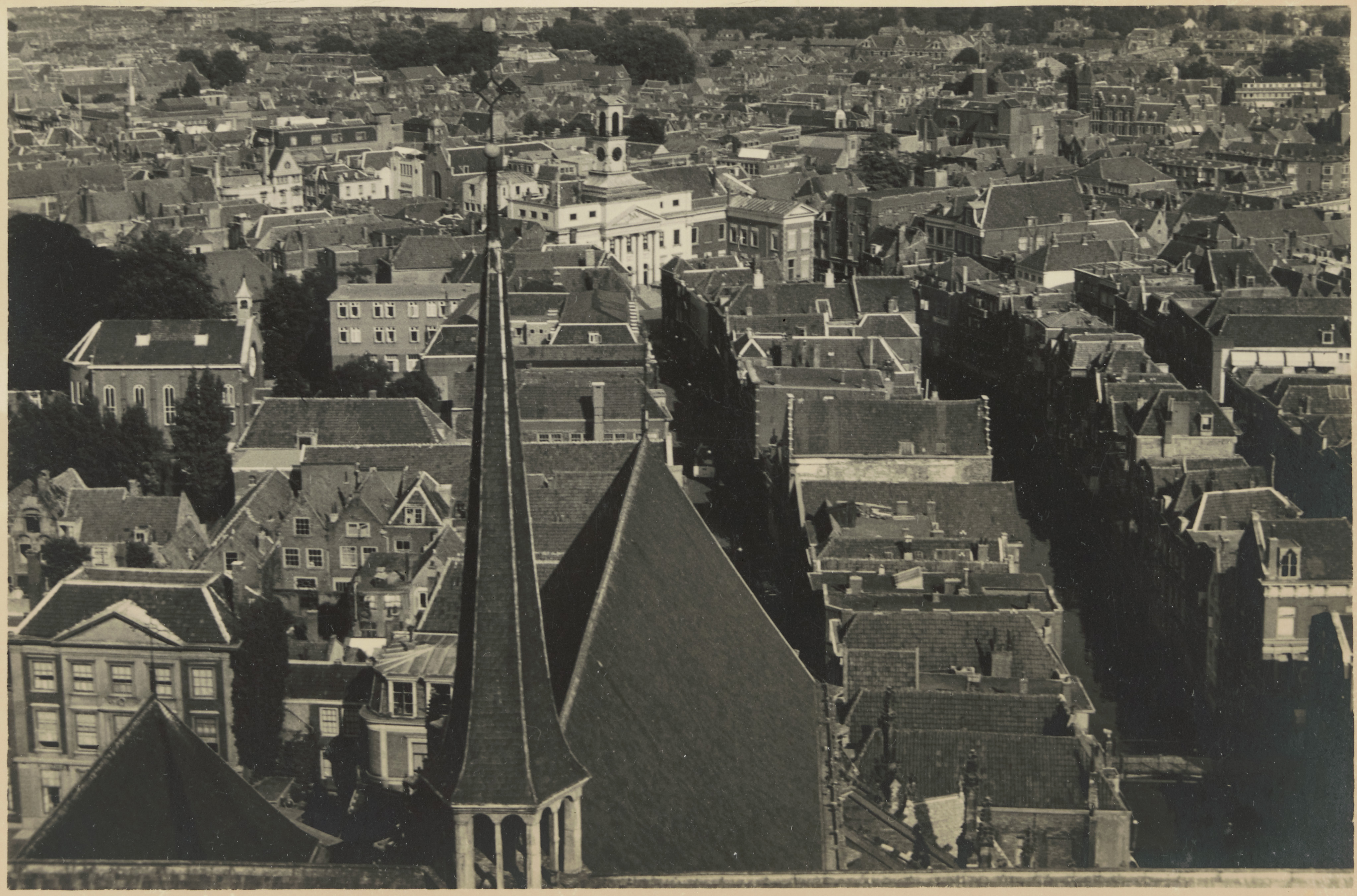 Panorama vanaf de Grote kerk naar het oosten. In het midden de Grotekerksbuurt richting stadhuis. Rechts daarvan de Voorstraatshaven, geheel rechts de Voorstraat. Links in het midden de Sint Jacobskapel, bij het Rooms Katholiek ziekenhuis.