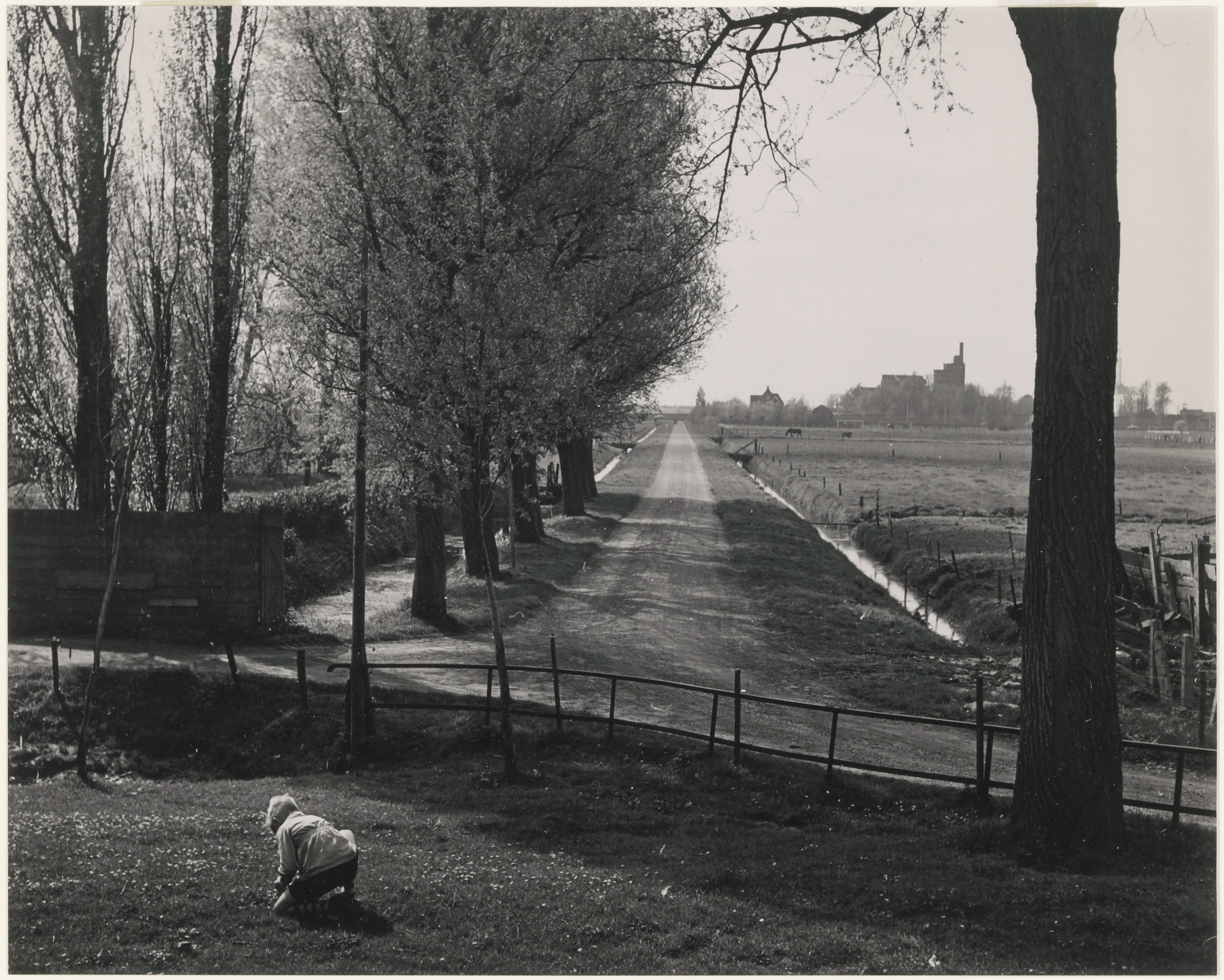 Krabbeweg richting Kilkade vanaf de Zuidendijk. Aan het eind van de Krabbeweg, op de hoek van de Straatweg, staat villa Merelhof. Het hoge gebouw is de stikstoffabriek aan de Kilkade.