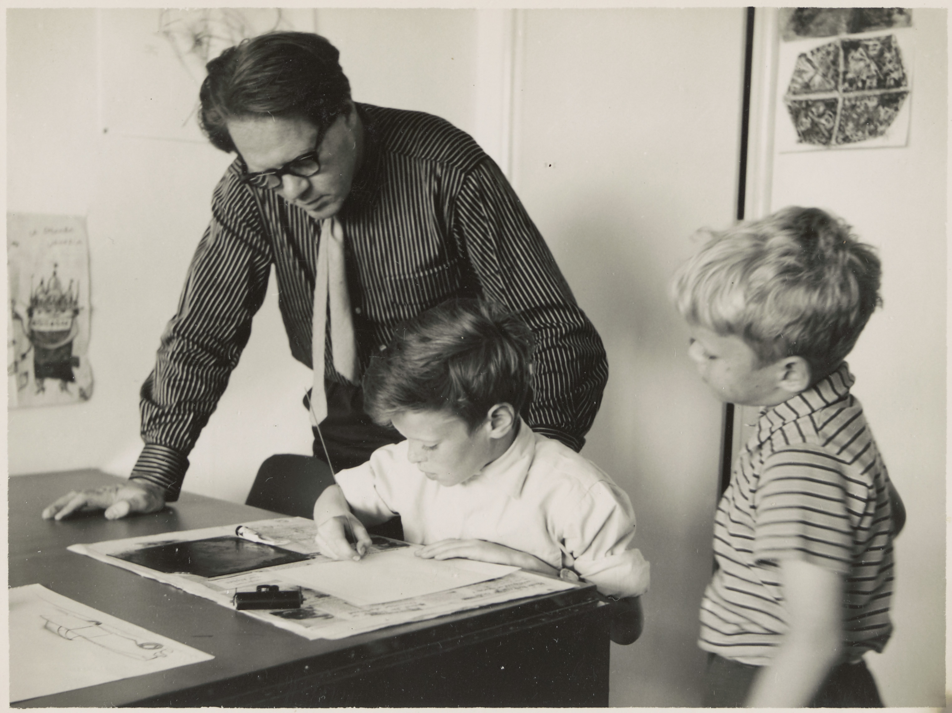 - Beeldend kunstenaar Otto Dicke demonstreert een druktechniek aan kinderen.