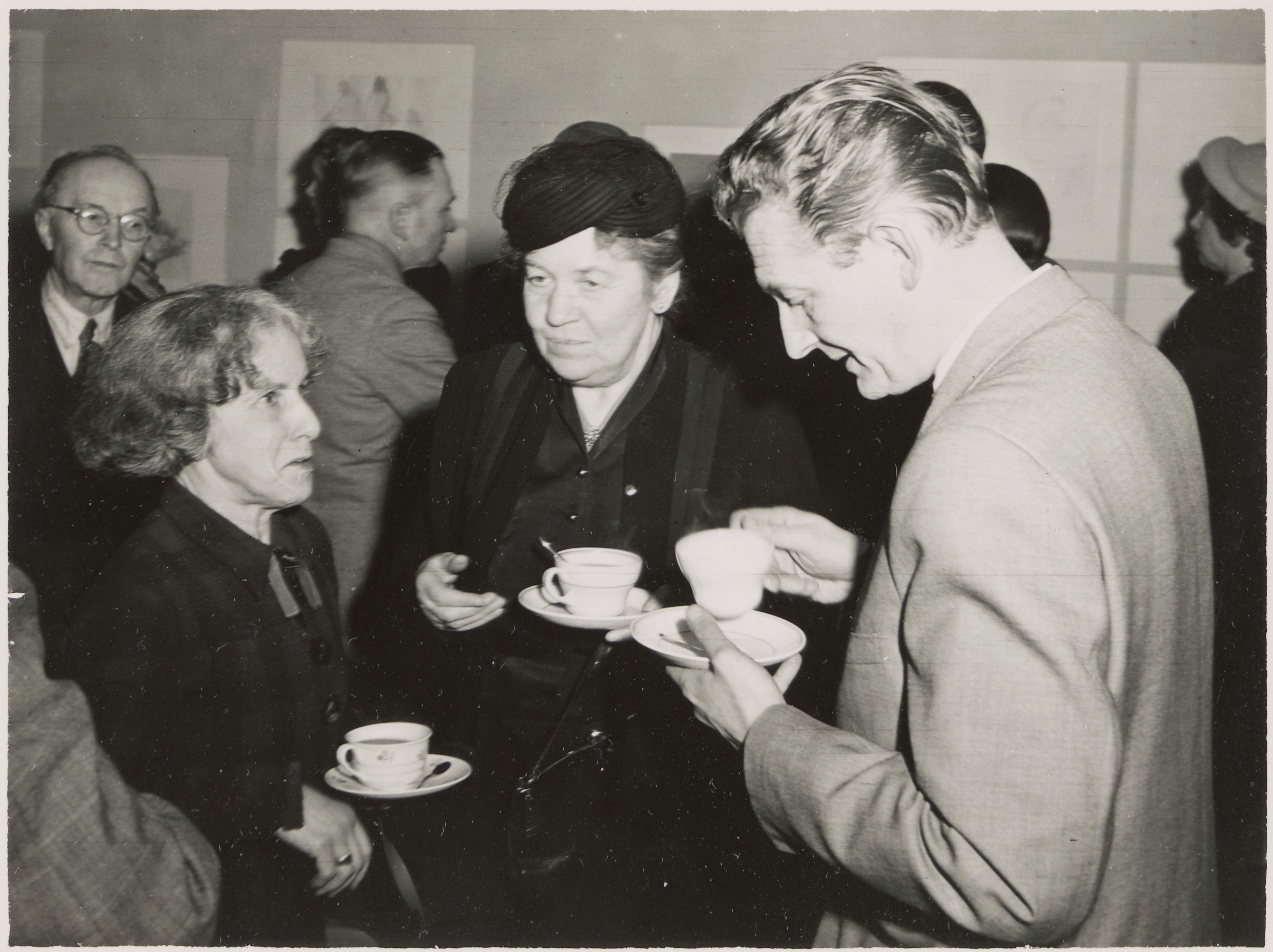 - De schrijvers Marie Schmitz, Top Naeff en Simon Carmiggelt in gesprek en koffiedrinkend bij de opening van een tentoonstelling van werken van Otto Dicke in Pictura.