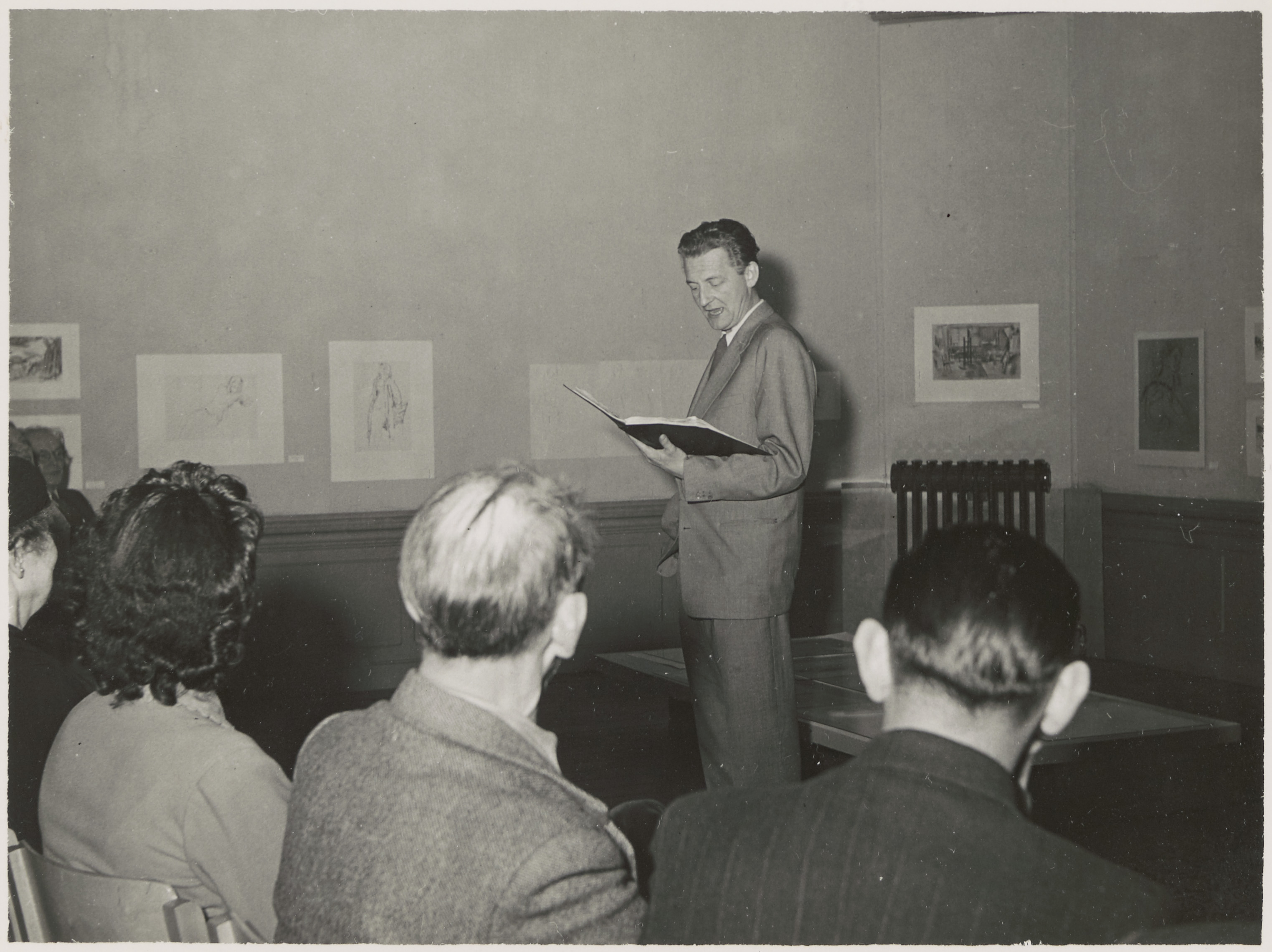 - De schrijver Simon Carmiggelt tijdens de opening van een tentoonstelling van werken van Otto Dicke in Pictura.