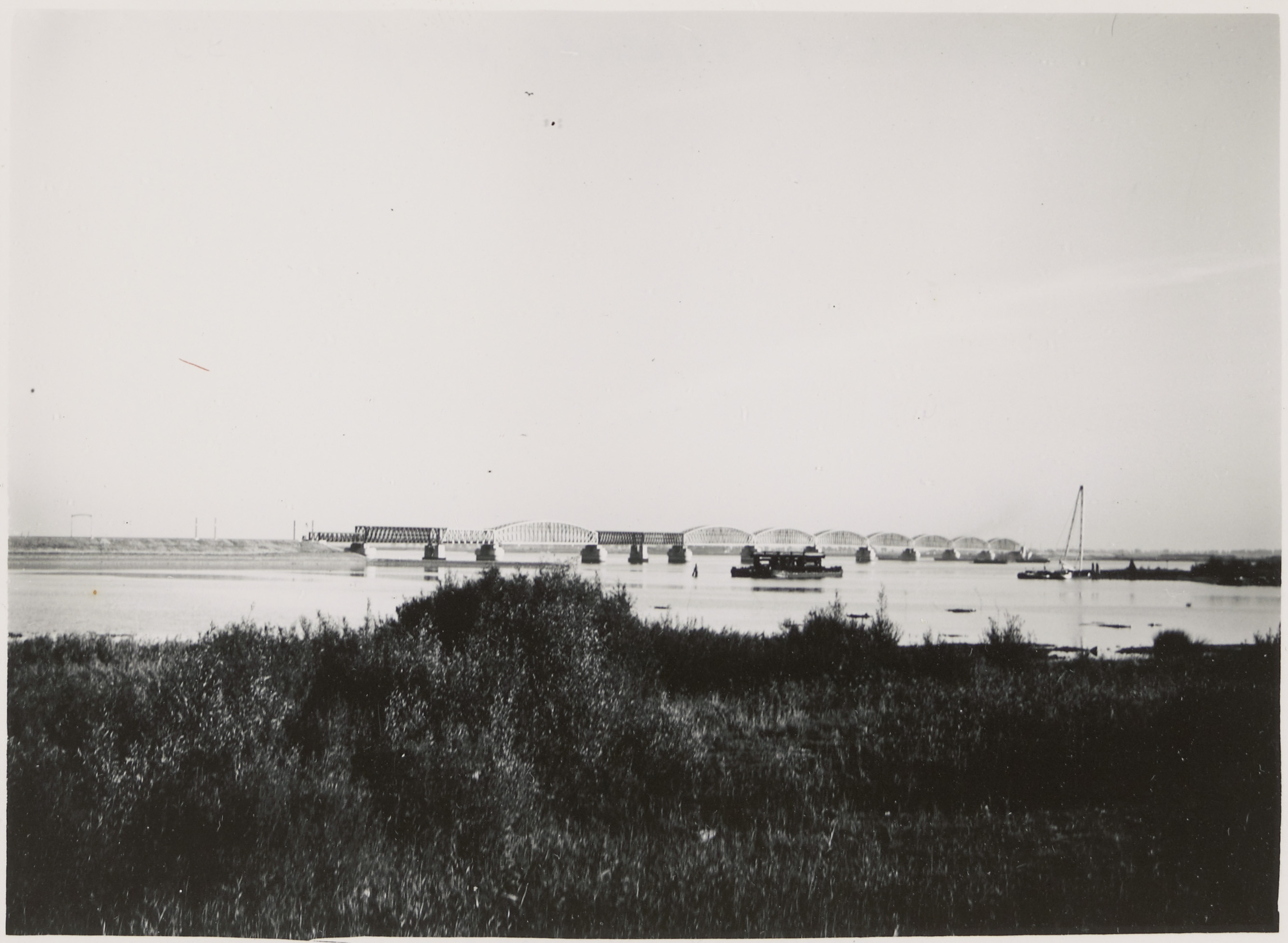De verwoeste Moerdijk spoorbrug is na de Tweede Wereldoorlog hersteld met delen van de …