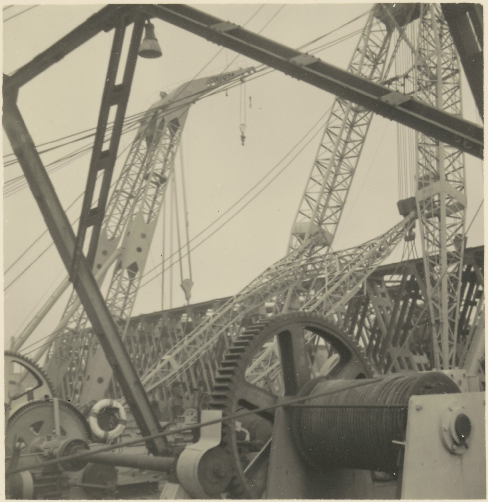 - Machinerie op drijvende bokken bij het herstel van oorlogsschade aan de spoorbrug over de Oude Maas naar Zwijndrecht.