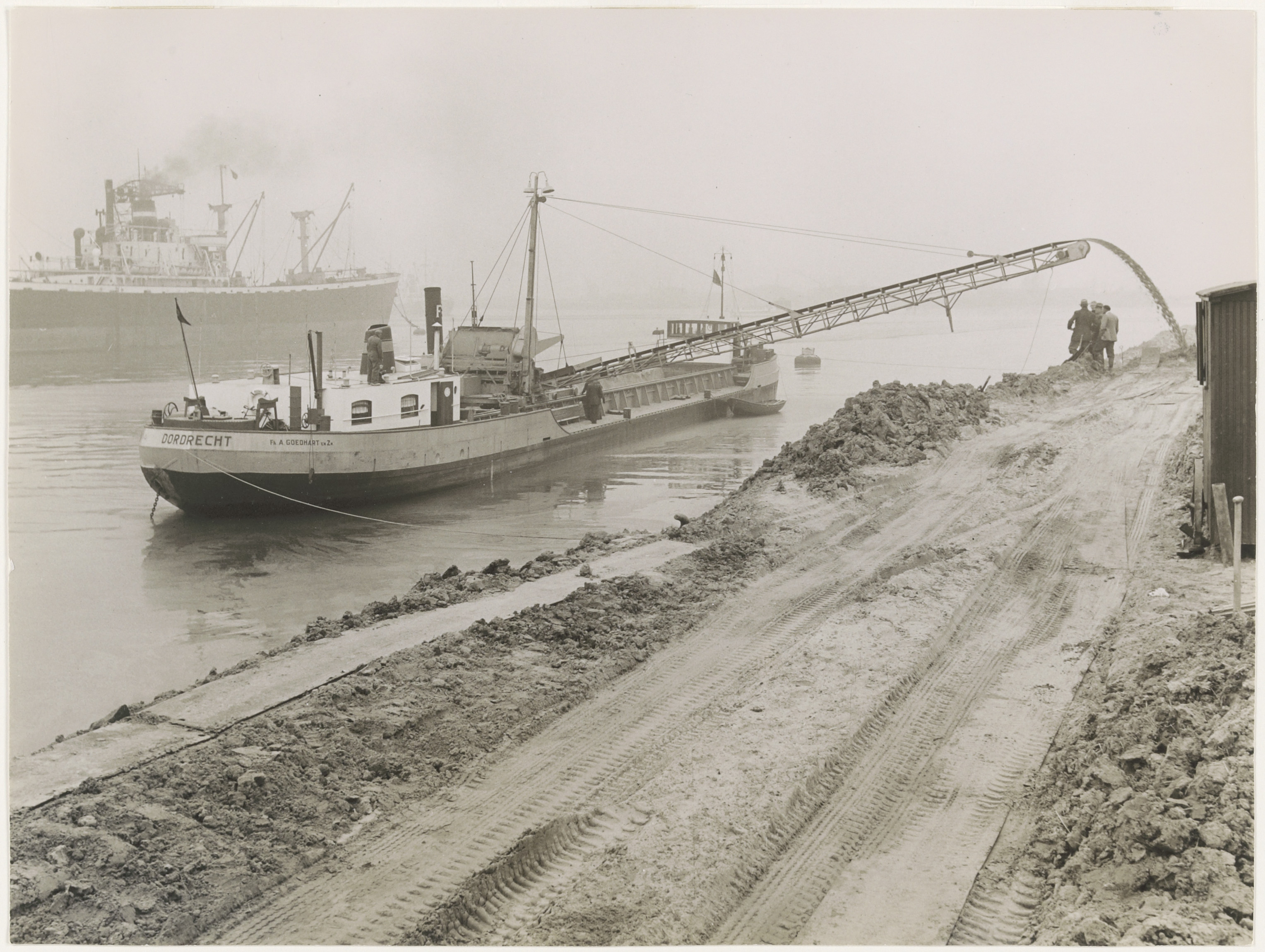- Vrachtschip Noord lost materiaal voor de aanleg van een dam.