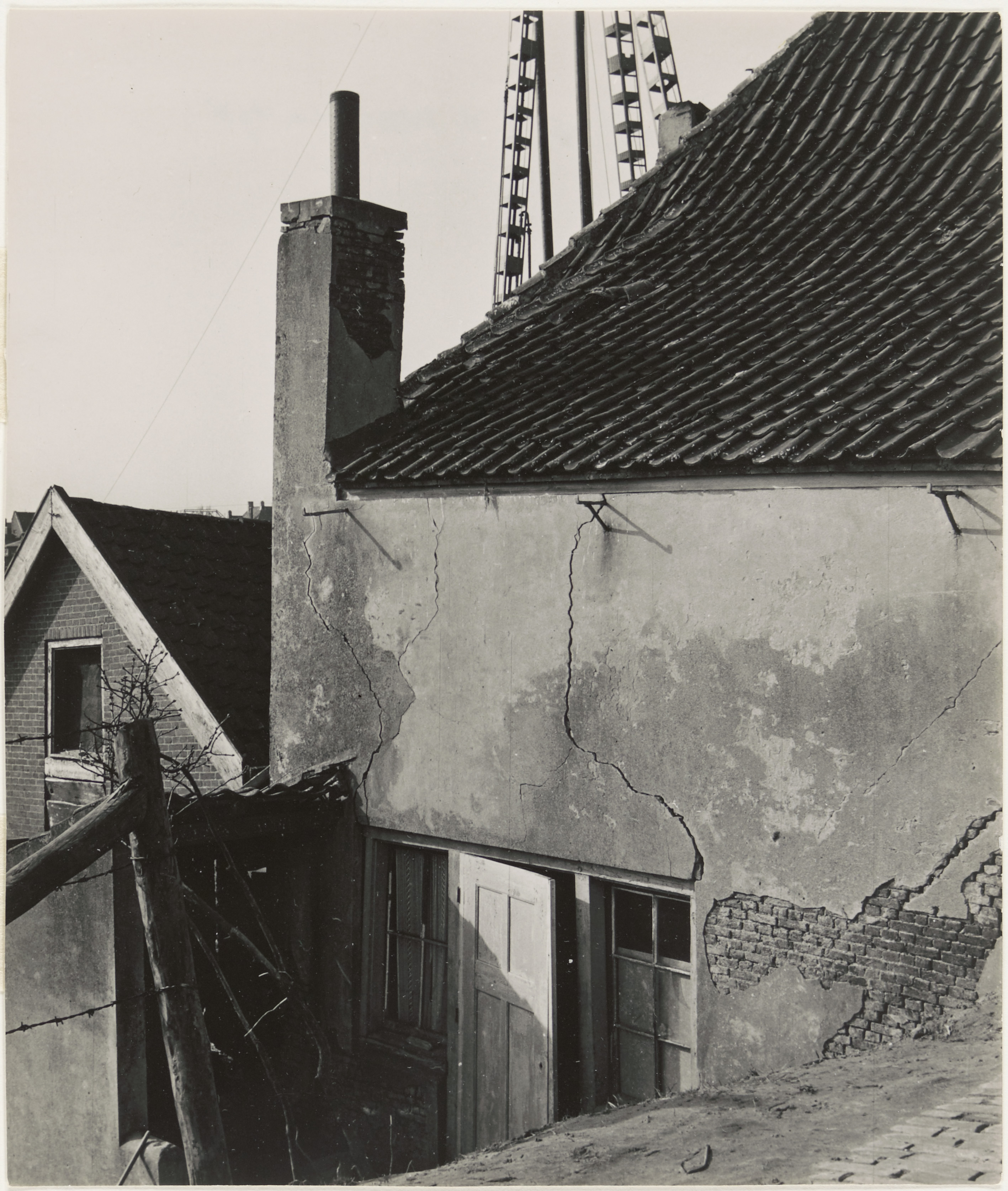 Oud boerderijtje aan de Noordendijk zuidzijde, ongeveer ter hoogte van (nu) de Wouwstraat. Op 552_402856 volledig te zien. Op de achtergrond een hijstelling voor de aanleg van de Vogelbuurt